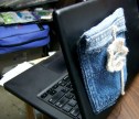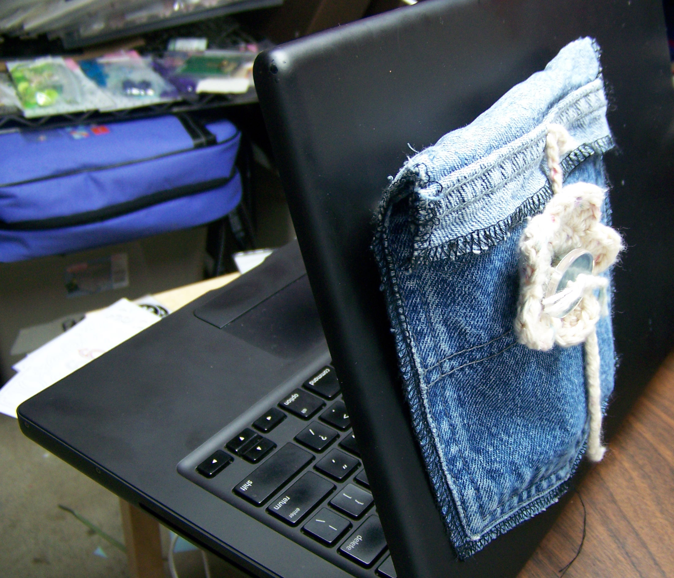 I recycled a pocket off a pair of jeans that had holes in them. I serged the edges, left some fabric at the top to form a flap. I crocheted a flower and tie to form a closure for the pocket.