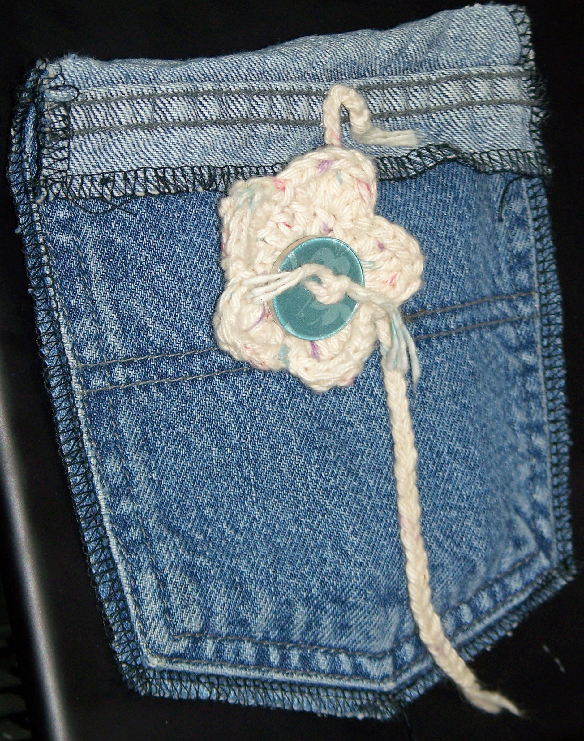 I recycled a pocket off a pair of jeans that had holes in them. I serged the edges, left some fabric at the top to form a flap. I crocheted a flower and tie to form a closure for the pocket.