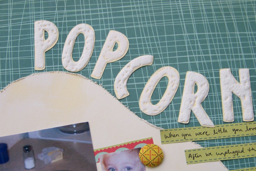 I had fun cutting out cardstock in the vague shape of popcorn for the background, inking edges to mimic butter and adding a fun title. Now here is where the lingering inspiration comes in.