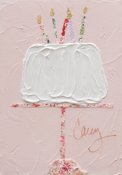 First I cut the cake + stand image on my Cricut. I then emossed the stand with copper embossing powder to give it a metal quality. I dabbed a scoop of modeling past on my craft sheet and colored it with a drop of brown dye ink. Using my Cricut spatula, I spread the modeling paste across the cake to give it a frosted texture. While it was drying I inked my background, created my candles and built up the card. Even then the cake was not dry. In the process of working with the modeling medium I learned a few things about it.