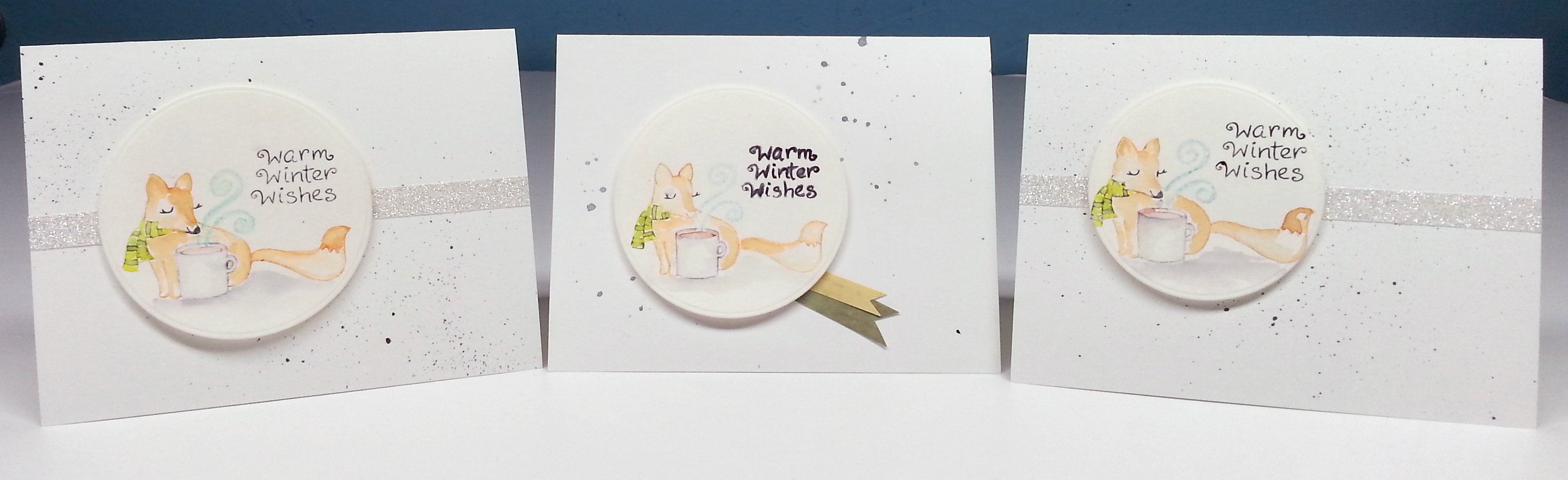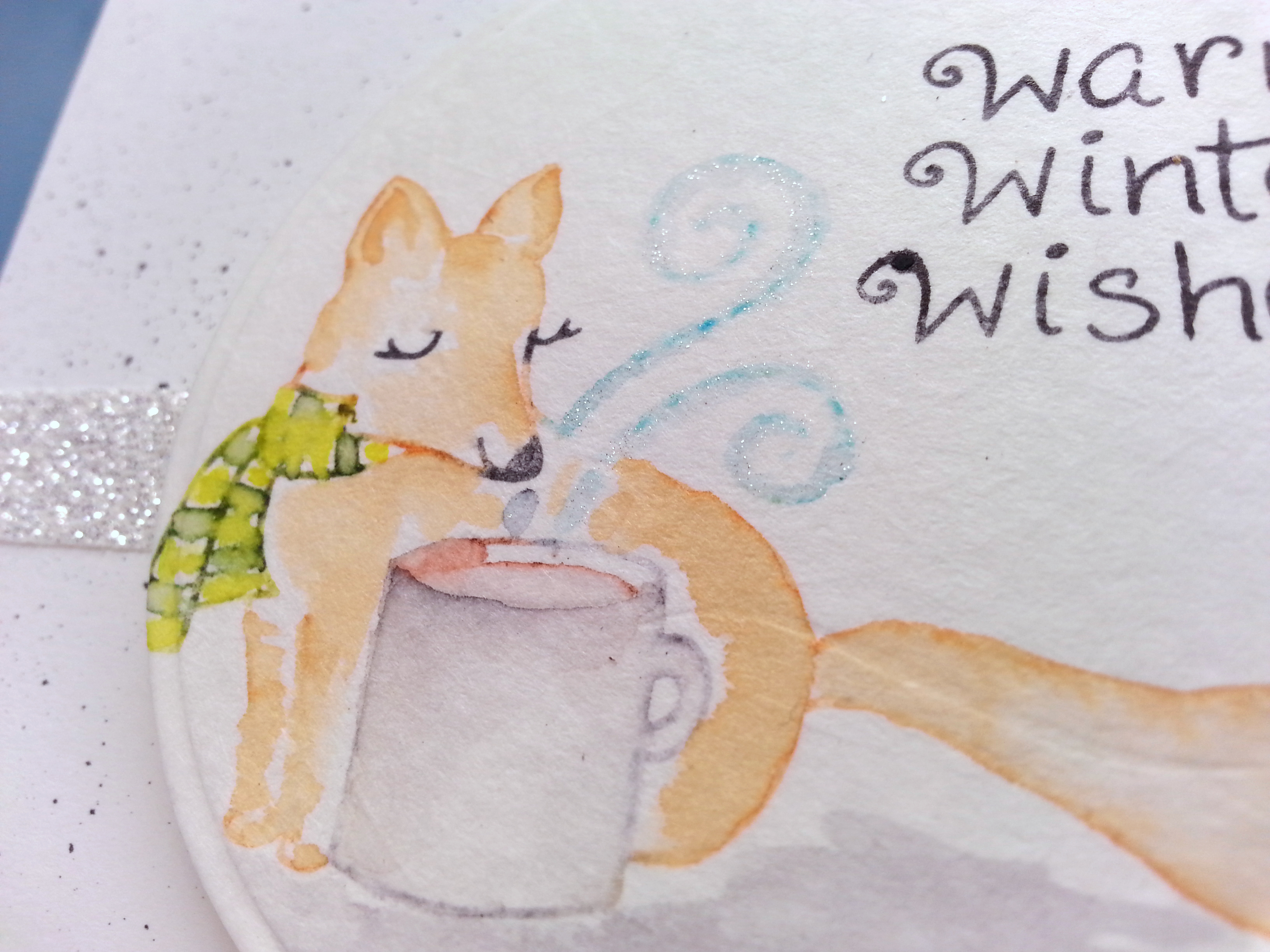 I used the wonderful Lawn Fawn Winter Fox stamp set. This is one of their small format (read affordable!) stamp sets and it is so friggin’ cute. I went with a watercolor technique for this. I inked up the stamp using markers of various colors and with a water brush I started softening the outline and pulling the color into the image. I scribbled a bit of extra ink onto a plastic sheet and picked up that extra color with my brush when needed. I used that extra color to add dimension to her nose, inside her left ear and under her chin. I also added more color to the rim of the coffee mug to make it pop a bit more. I got it a little too wet and my brown coffee color bled a little. But oh well. That is life with watercoloring. Notice the white around her mouth and each eye, next to her scarf and in between her legs? That white space actually adds dimension and makes the image less flat looking. When going with watercolor, less can sometimes be more. And just to show you what I mean, here is the original cutie.