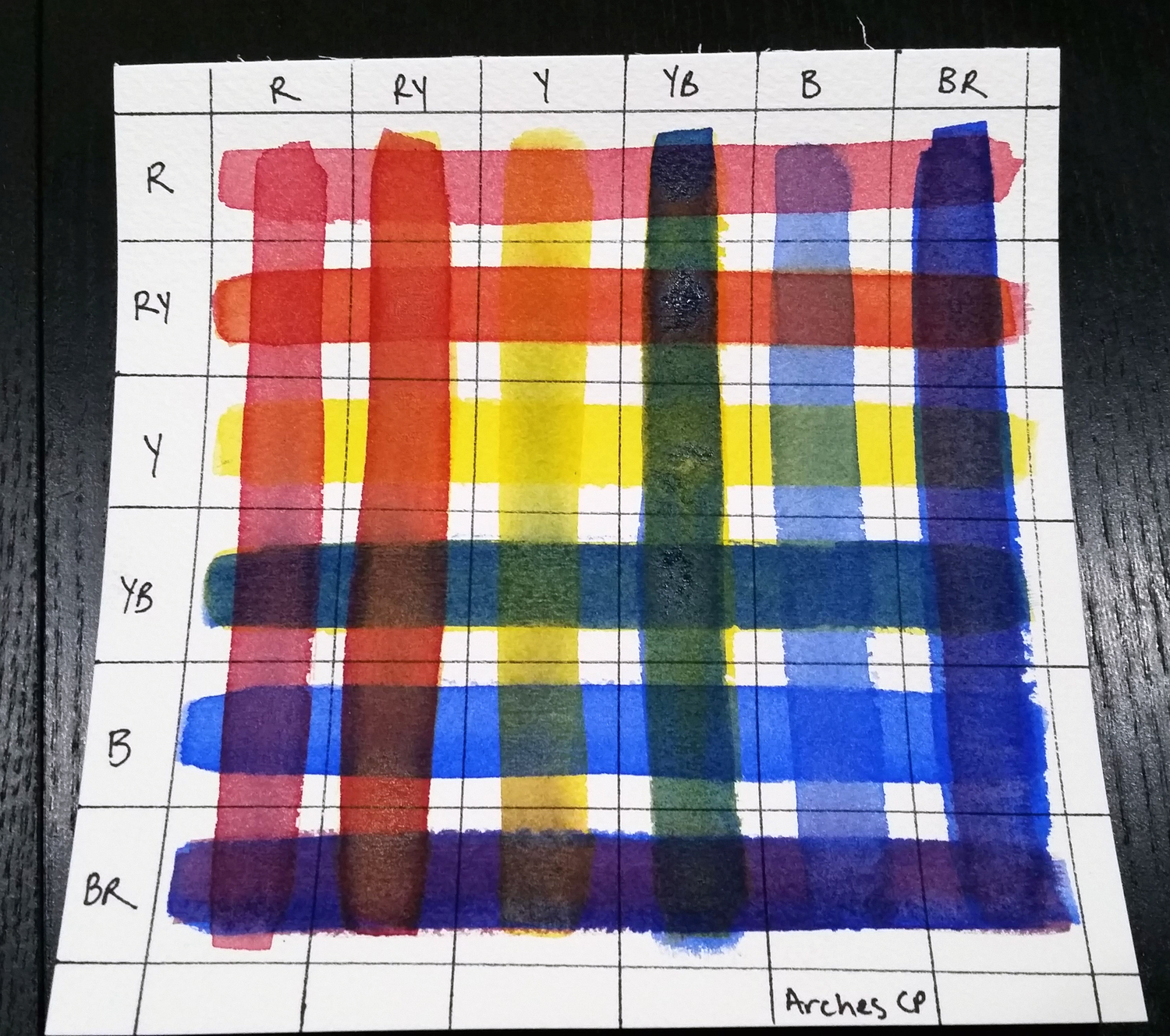 Last time I showed you color swatches. This time I am using just the primary colors (all I own of a “pro” quality paint) to create color wheels and what is called a glazing chart (a new concept for me!). I’ve used Winsor & Newton Professional line of paints. I have a set of “cheap” paints but bought primaries of these professional paints just to see what the difference is. All the samples in this post are used just with these paints.
