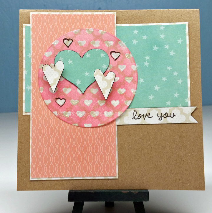 I used the Stencil DIY stack for this one. Even the card base is kraft paper from the stack, cut to create a large 6×6 card. To create the circle, I heat embossed the little hearts over a white pattern paper (using the heart stencil and clear embossing powder). I then inked over that with pink ink. You can still see the pattern even under the ink. I then used a pen to outline a few hearts to add extra layers to this simple card. It is a nice effect. Add a few more hearts and it is done.