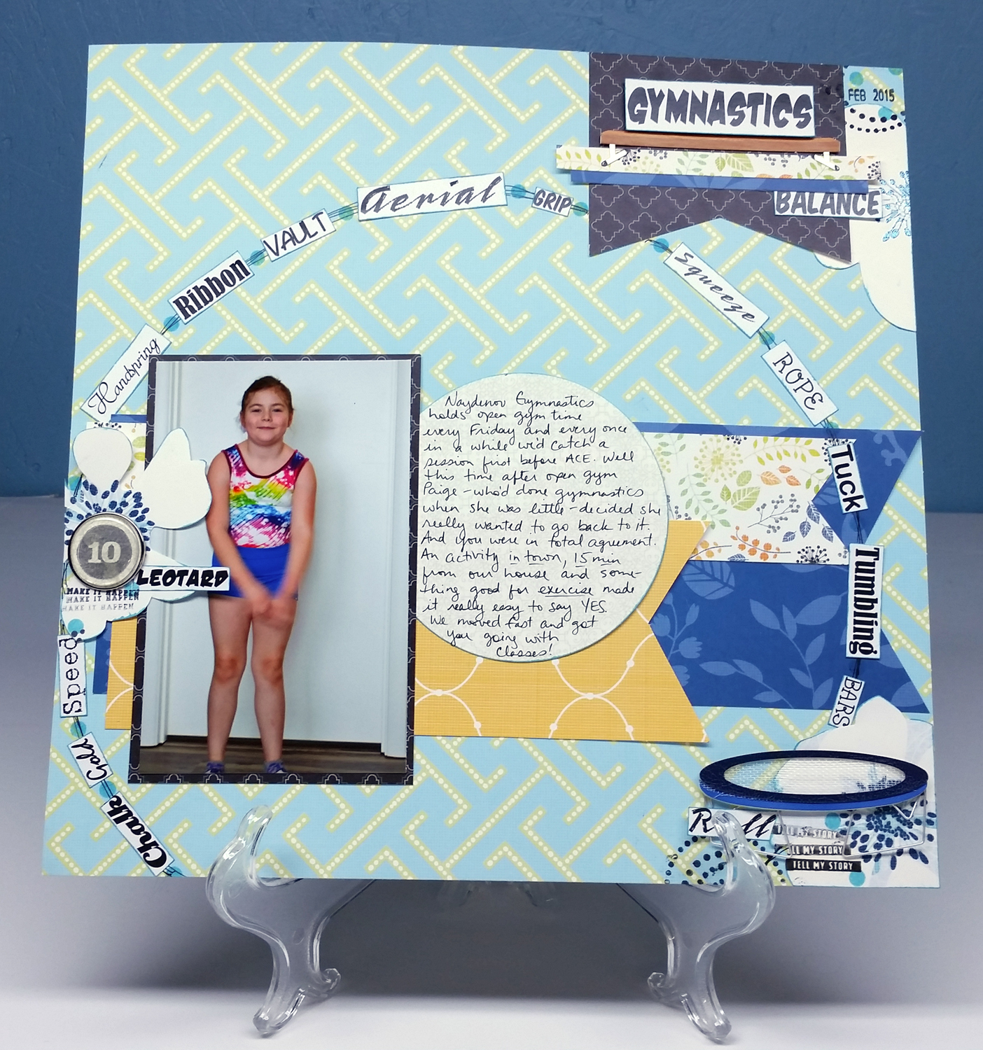 I used the DCWV Blue Citrus stack, plus some gymnastics paper and embellishments I’ve been hanging on to for years. My older two kids took gymnastics when they were younger and I never scrapped any of that adventure. Now that my middle & youngest are (back) into gymnastics, I can pull that product back out!