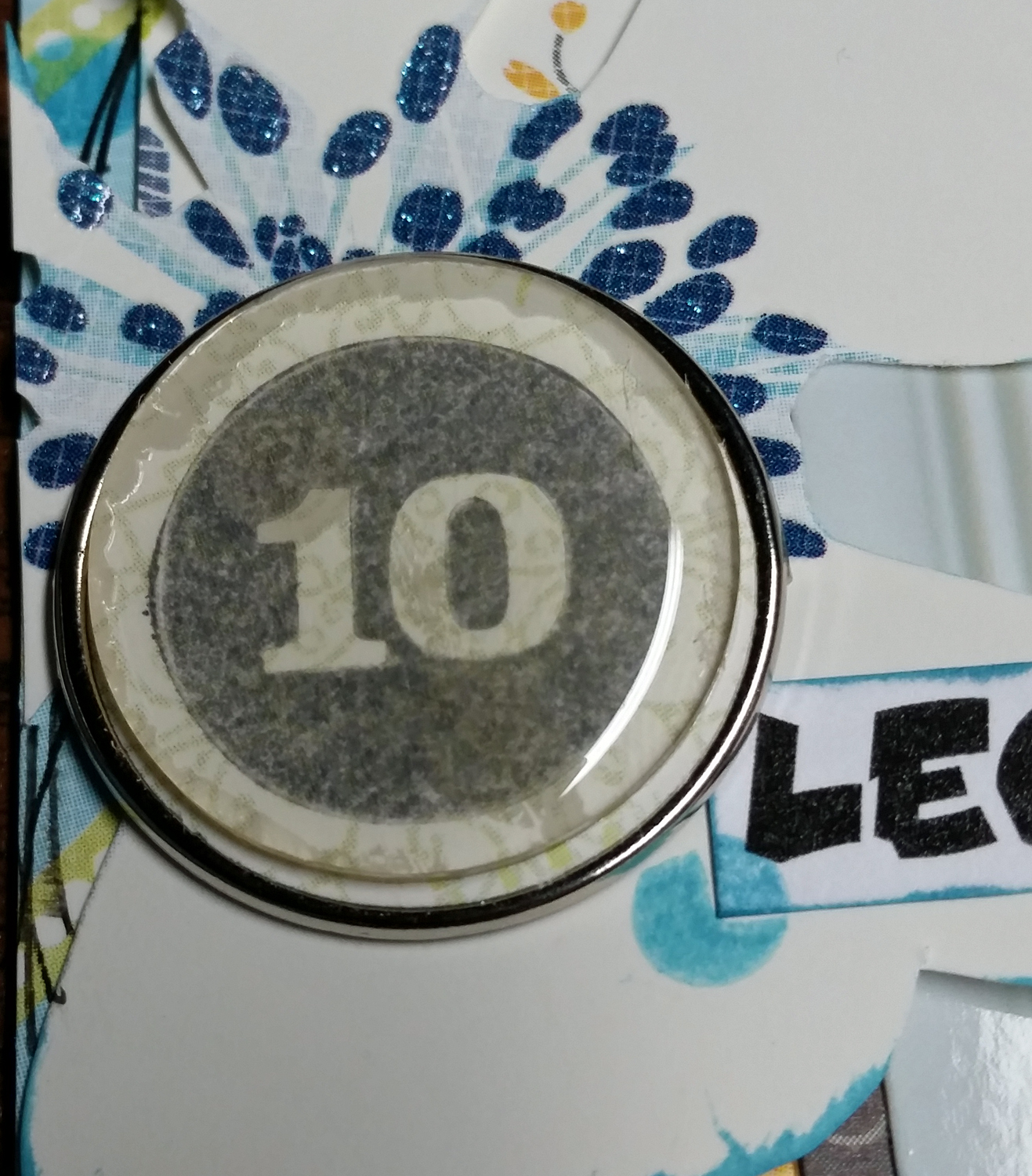 But the color and distressed look was too harsh for this layout. So I took the idea, and parts of the embellishment, and altered it to fit my needs. I pulled off the epoxy top layer & sticker. I punched a circle from the same paper I used for my journaling and stamped a “10” on it in a lighter ink. I added this back onto the brad and found in my stash an epoxy circle that just fit over to make the brad look almost exactly as it was to begin with. It just has a new toned down color that fits a bit better.