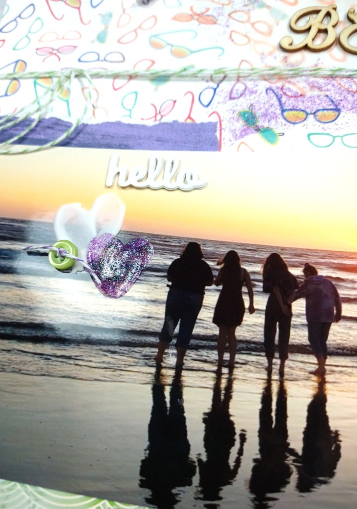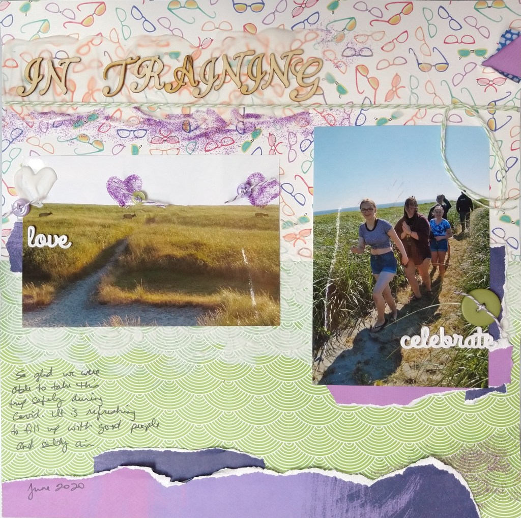 I turned to the Counterfeit Kit Challenge blog for some inspiration. They offer crafty challenges on the 12th and 18th of every month to help boost our creativity. And I really needed that. April 12th’s challenge was titled “Al Fresco” and it was about finding inspiration in the outdoors in some way. I took on that challenge with some mixed media on a double page layout about a beach trip.