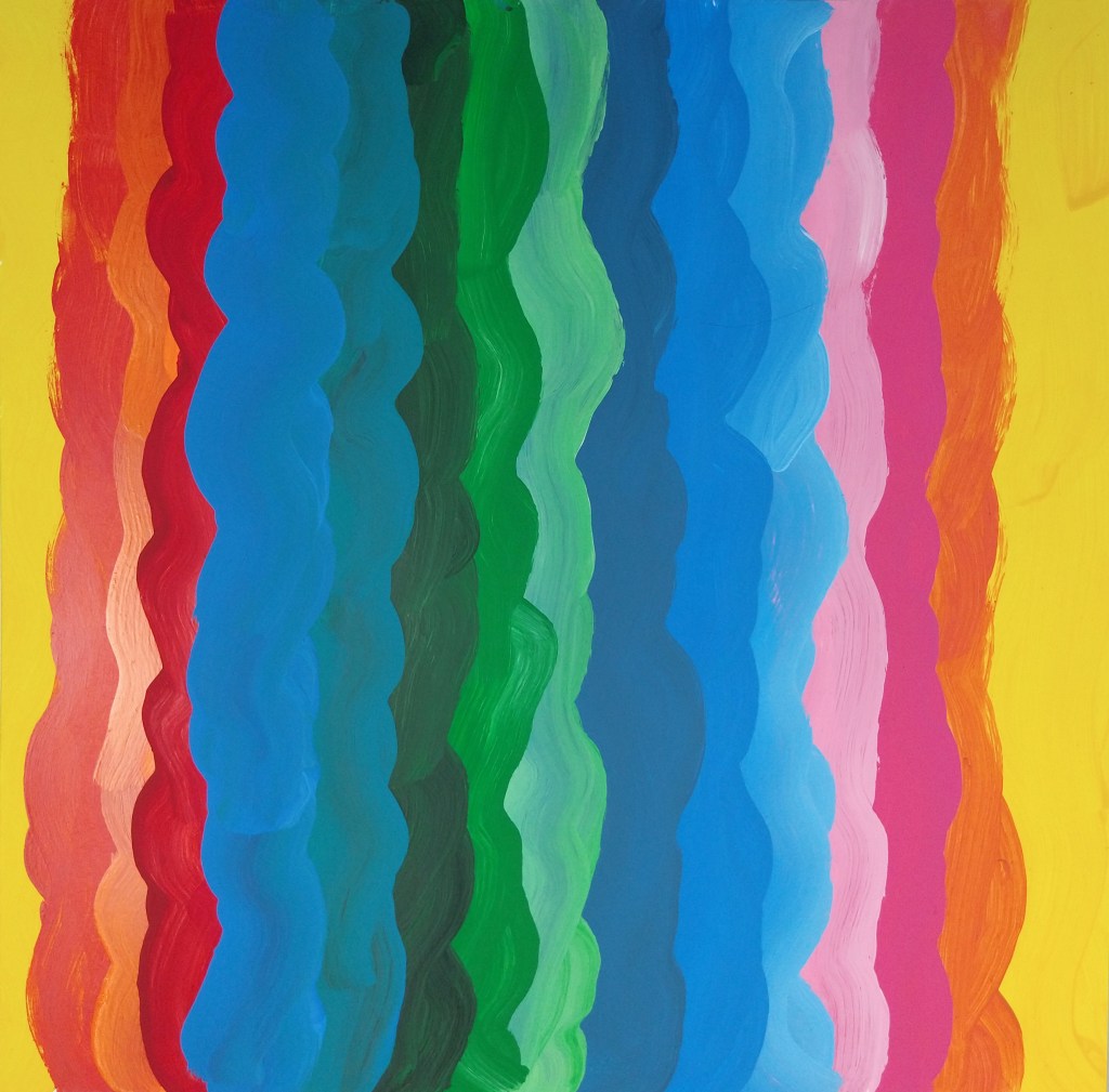 So, what is my final feeling about this piece? I like it as its own project. I like the texture that came from the brush I used. I knew I would not get a smooth feel from that brush and I was okay with that difference. The texture came out how I imagined it would. But… did I get the feel I was going for in the original? Not really. My piece does not have the light and airy feel of the original. My colors are too saturated. Mine is also less dynamic. What I mean by that is all of my stripes are too similar. Notice in the original that the stripes widen and narrow across the length of the page. My stripes do not do that as much.