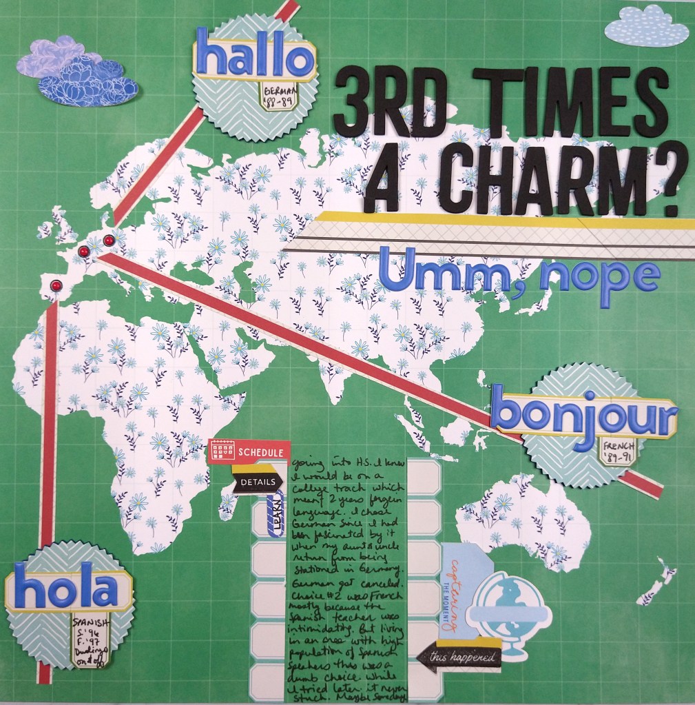 It is the 18th, which means it is time for scrappy challenge number two over at the Counterfeit Kit Challenge blog. Todays challenge is to use foreign language somehow on your page. I took that prompt and just rolled with it! I used it as the main focus of my page to talk about how I tried at three different times to learn foreign languages and none of them really stuck.