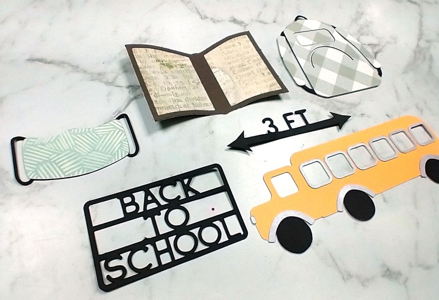 This month’s file is all about Back to School! With all of the US schools reopening full time this fall going back to school means something this year that it hasn’t in years past! I wanted to honor that story telling with this cut file. You have your typical school icons such as a bus, backpack and book. But you now have the mask and distancing sign which many schools are using as part of the CDC guidelines.