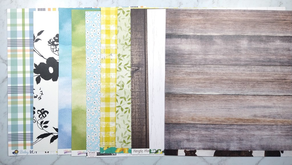 The first thing I noticed about the kit is the warm oranges and browns of the classic fall season imagery. Since these are not my favorite colors and I am just plain not ready for fall, I looked deeper at the kit for inspiration. The Heidi Swapp blue and yellow stripe/geometric paper caught my attention next. I know I have this paper in my stash… well at least I thought I did. When building my kit I just couldn’t find it. (I may have tucked it away in another project and since forgotten which project and where!) Despite not being able to find that paper I let the colors lead the way for me. And then I followed this inspiration kit’s path in terms of pattern. I found some plaids/checks, a bold floral, woodgrain and some watercolor textures. I then added a couple of supporting patterns to round out the choices.