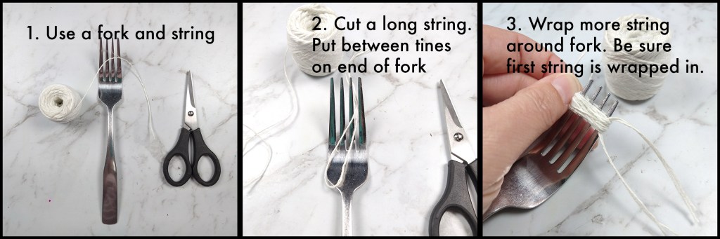 You can follow along on this photo tutorial to create simple little tassels. I used literal bakers twine here from the kitchen section of my grocer, but any light weight twine or embroidery floss will work.