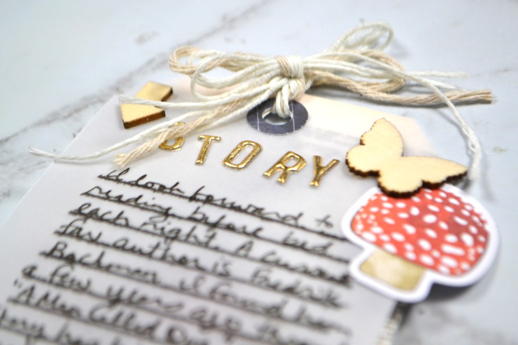 The journaling tag tucks behind the “My Happy Place” title card and actually covers up that gnome embellishment. It is a bit of a surprise to find that guy back there when the journaling is pulled out. You can see all the layout creation details below.