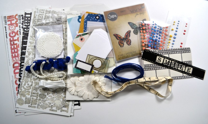For embellishing I pulled plenty of things straight from the inspiration: butterlies (or at least a way to create them!), enamel dots, flowers, tags and ribbons. Then I added in doilies, film strips and buttons (oops, the photo doesn’t include the buttons; trust me, I have them.)