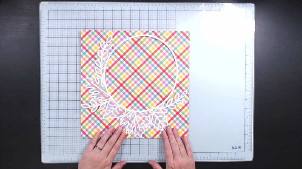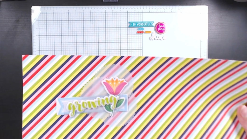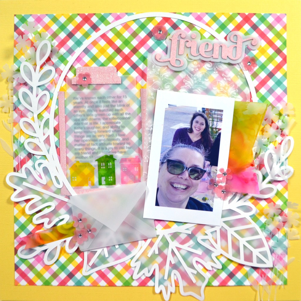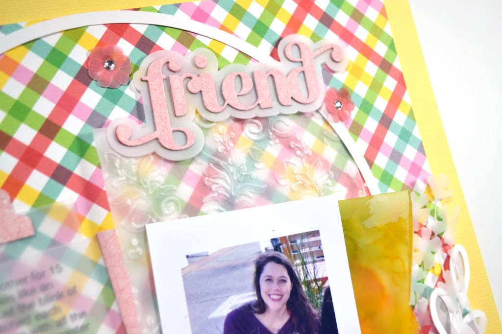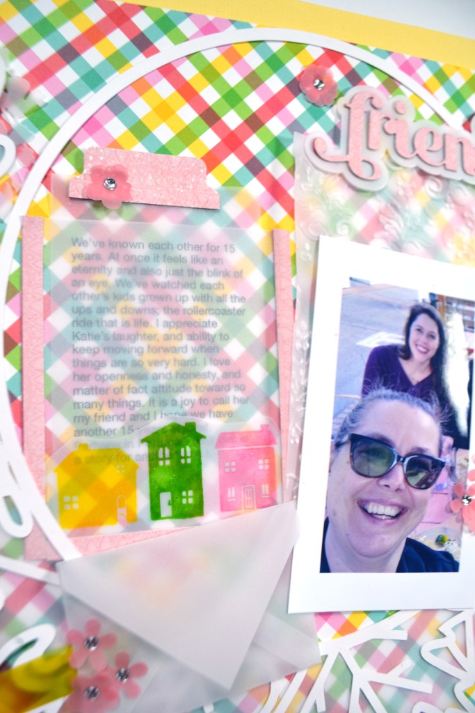 Once I had created a pile of goodies out of vellum I turned to creating a layout. If card making is your thing, these ideas totally work for that too! Now, not all the things I created are going to work on one project so the process of finding what will work, and especially giving up on what won’t work, is interesting. I tried really hard to get stamped flowers on my project and they just weren’t working. The flowers got lost in the amount of pattern shining through the vellum. In the end I colored vellum with a marker (that is your bonus technique!) and punched out solid colored flowers to sprinkle on my project.