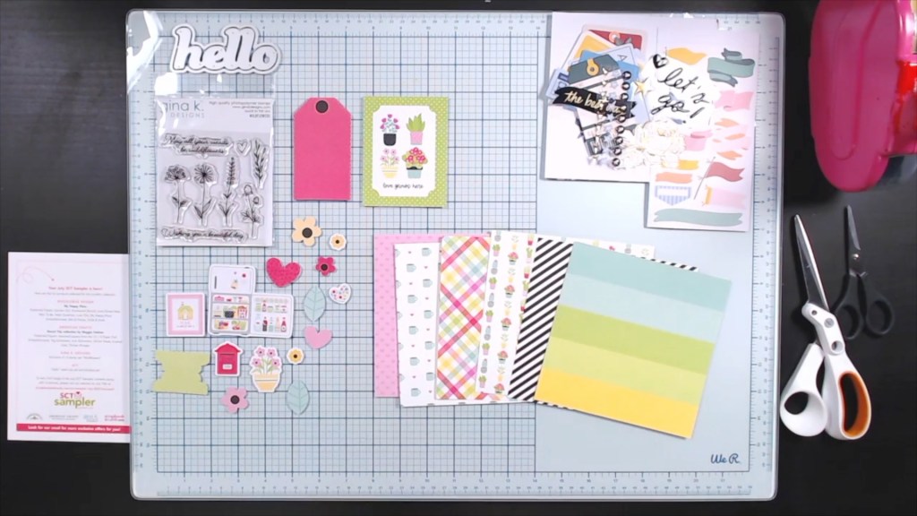 Getting my SCT Sampler kit in the mail each month is a bright spot. This small affordable package is just enough newness + surprise to keep me satisfied. This month the package contained products from Maggie Holmes, Doodlebug, and a stamp set from Gina K designs. We also have our word die cut from the SCT company.