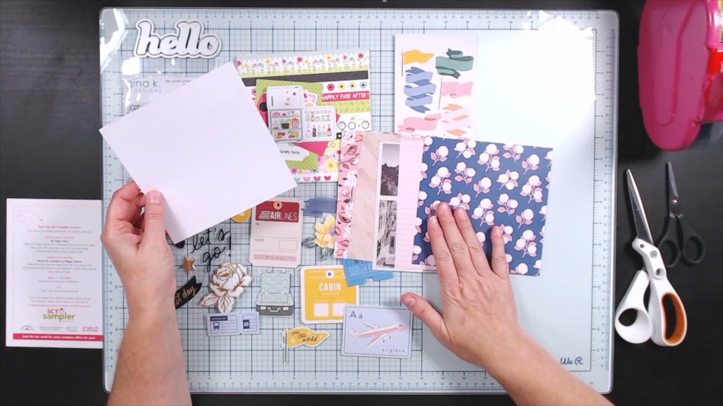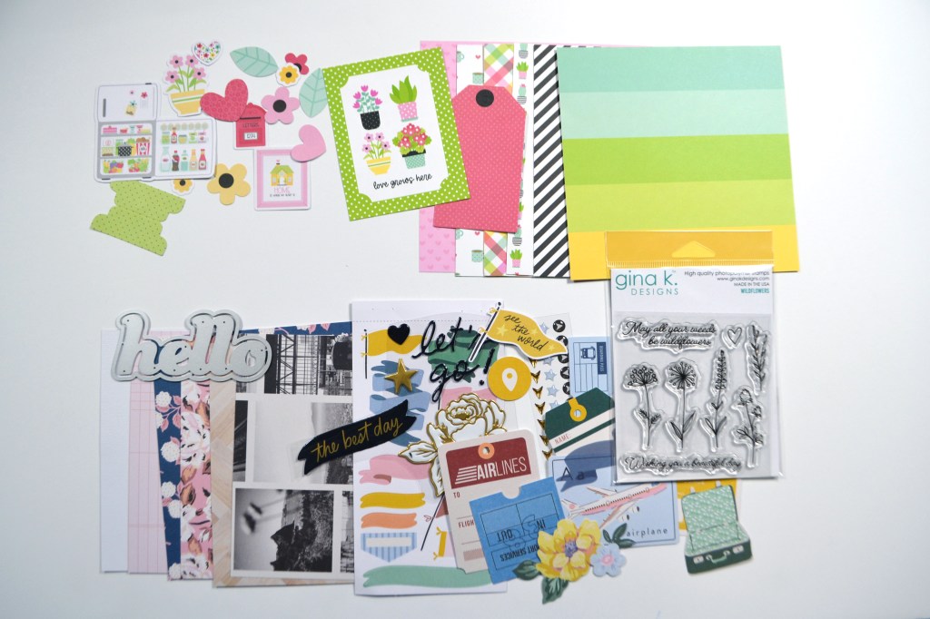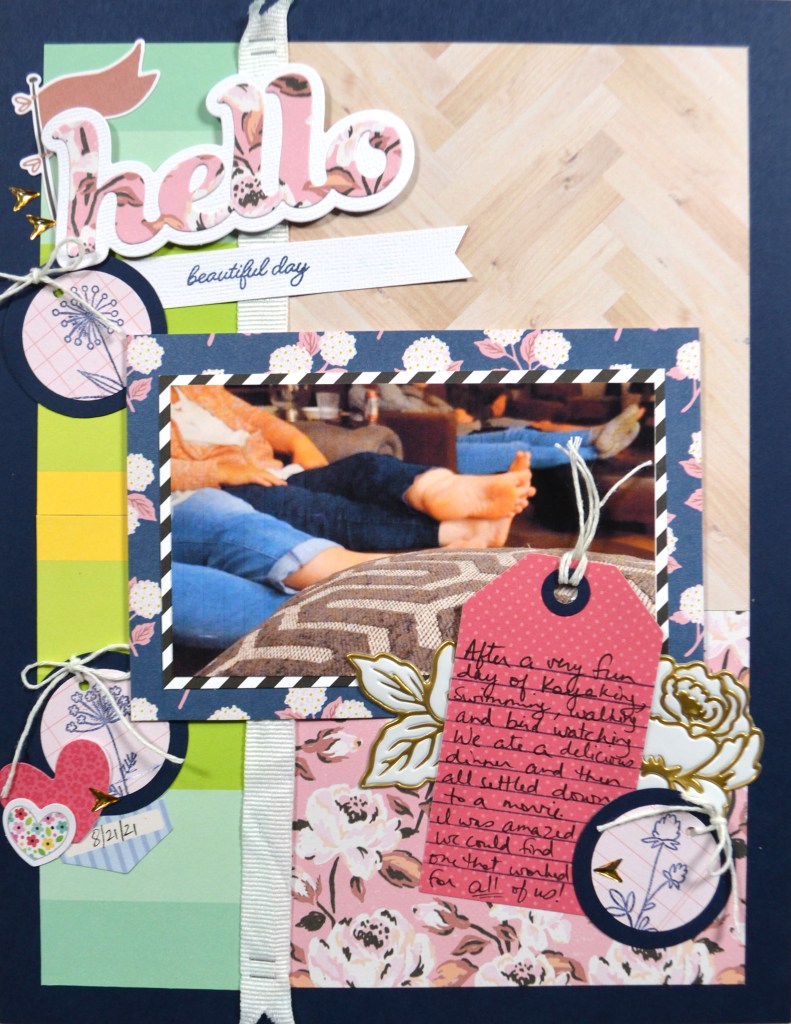 I wouldn’t want to leave you wondering just what to do with these supplies. So I almost always make a project as soon as my box arrives. That way I am sure to use it instead of just showing it off. This time around I made and 8.5 x 11 layout featuring a vacation photo. And when I create a project using my samplers I really try to pull at least one thing from each of the supply categories included in the kit: the die set, the reusable item and each of the two manufactures.