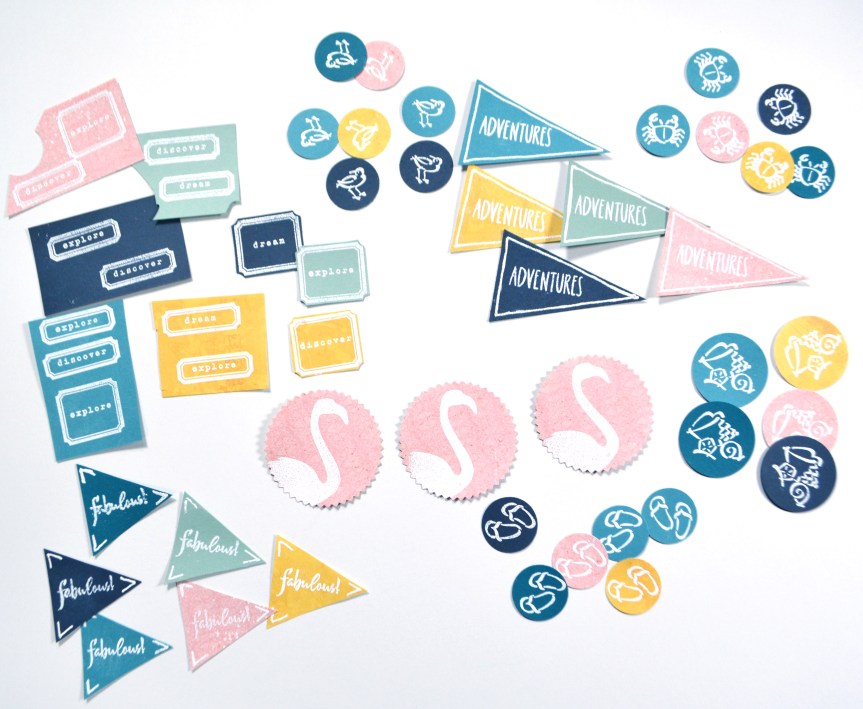 It is challenge time over on the Counterfeit Kit Challenge blog. Our hostess for the month, Julene was inspired by the pennant puffy stickers in our inspiration kit for challenge number two. So this time we are embellishing with pennants! Before we go much further, let’s take another peek at the inspiration kit from Citrus Twist Kit called Travelogue Life from April of this year.