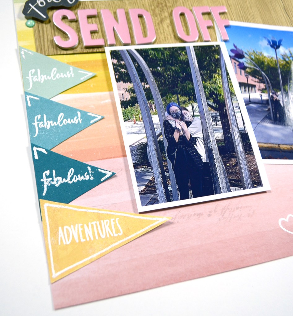 Since I had plenty of embellishments to work with this layout came together pretty quickly. I did end up creating MORE pennants to add a bit of balance to the layout. I cut them and then simply traced them with a white gel pen. I intended to add some embossing detail to them, but for some reason my powder wasn’t sticking. So I ditched that idea and just left them with some “watermark” detail instead. It isn’t showing up well, but such is the way of cameras and lighting sometimes.