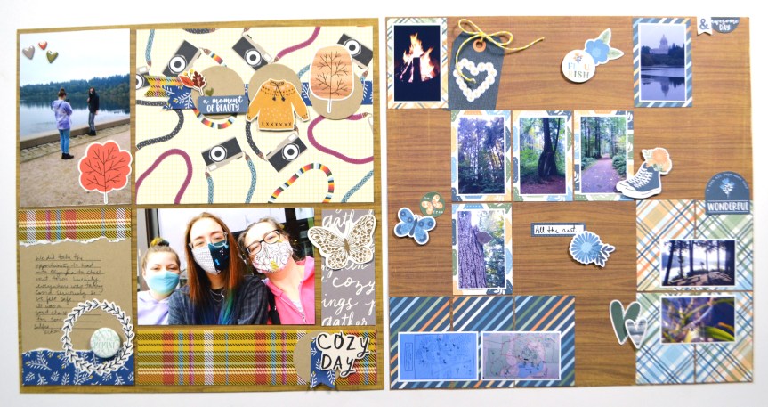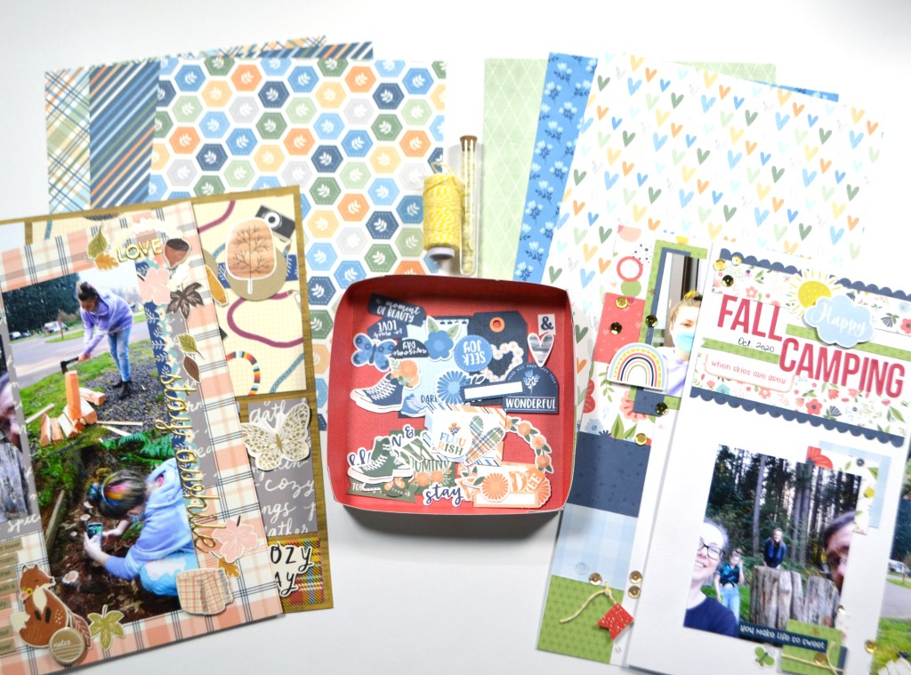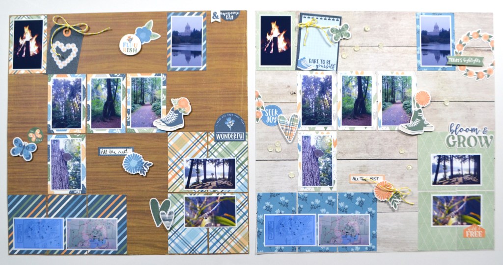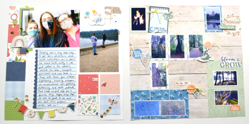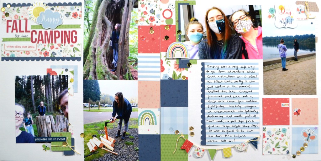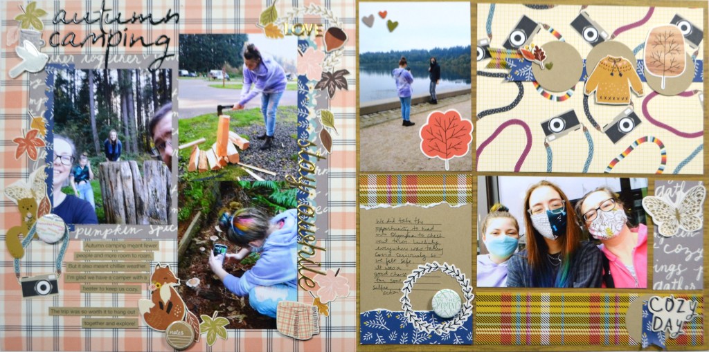 The reason behind this mini kit was to create a “gallery” page of smaller, detail photos from a camping trip to accompany an existing 2-page spread. In fact I have TWO of those existing spreads, one in each kids’ album, that I need “gallery” pages for. Here is a look at the existing spreads. (Click for larger views!)