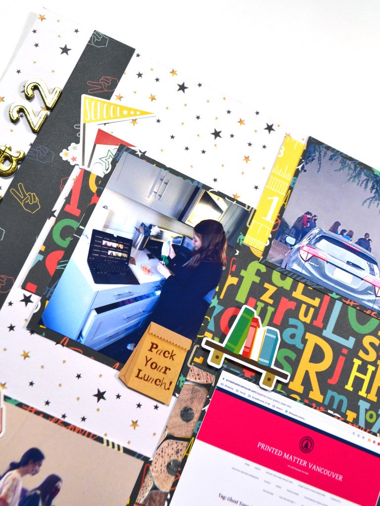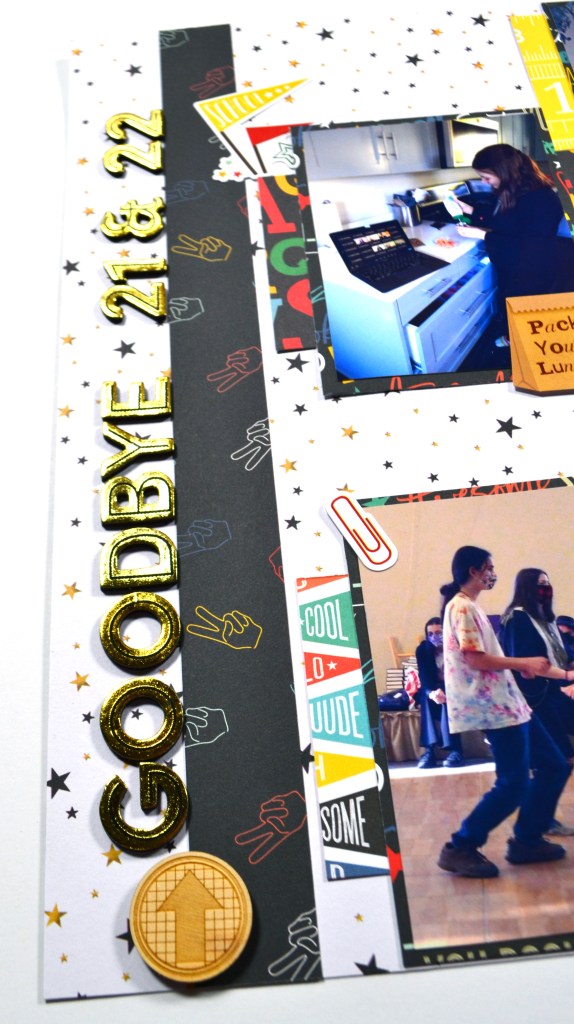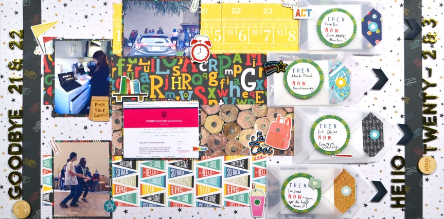 This is how the layout finished up. I took a Then & Now approach since my daughter goes to an alternative school and hasn’t yet started back for this fall! As I was looking through photos to try and figure out an approach to the hop I realized I had plenty of school photos from the previous year. Since most of her classes for this year relate to last year I thought making notes of what is the same and what is different would be fun.