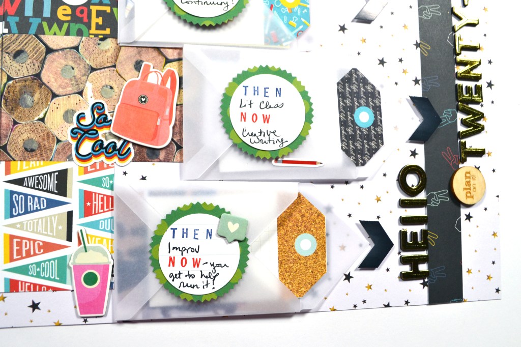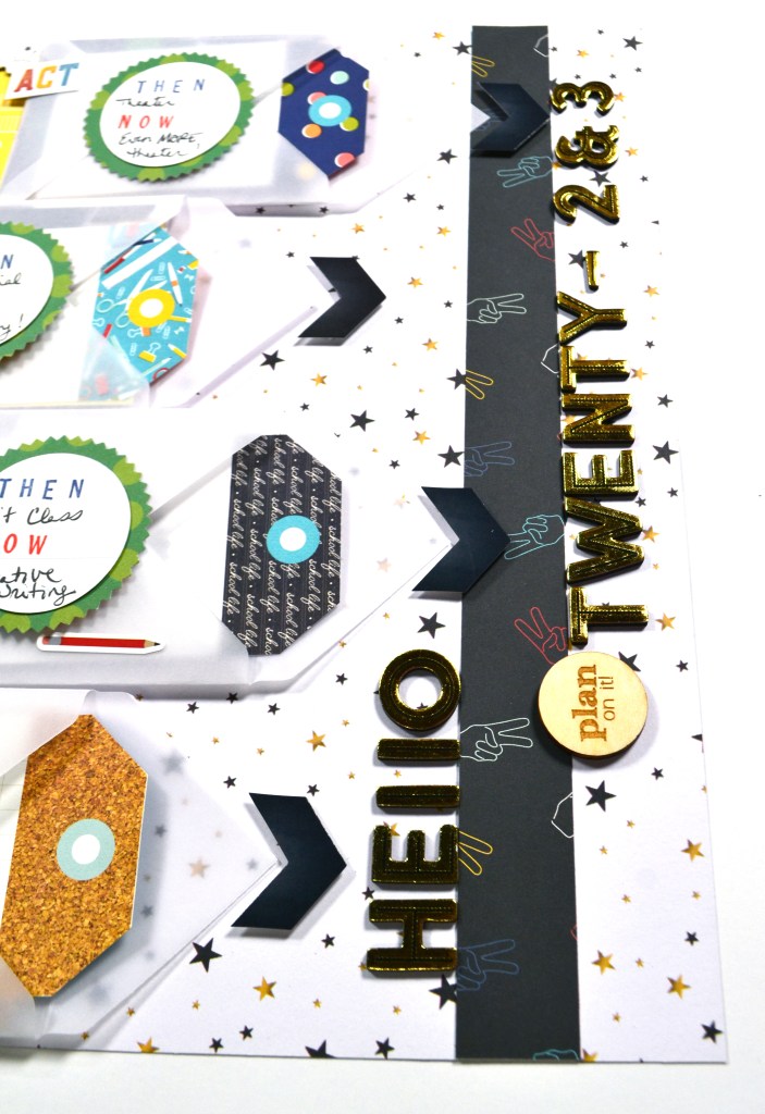 The little envelopes on the right hold more photos from last year and a journal tag that will have details on how things will be different this year. Plus the envelope flap looks like an arrow, so I added more arrow style embellishments to emphasize the title on the right for this new year.