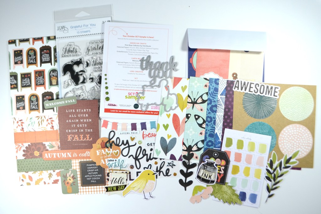 Here is the kit this month! We’ve got our reusable supply (stamp set from LDRS), our word die and supplies from Carta Bella’s Welcome Fall collection** and Vicki Boutin’s Print Shop collection**.