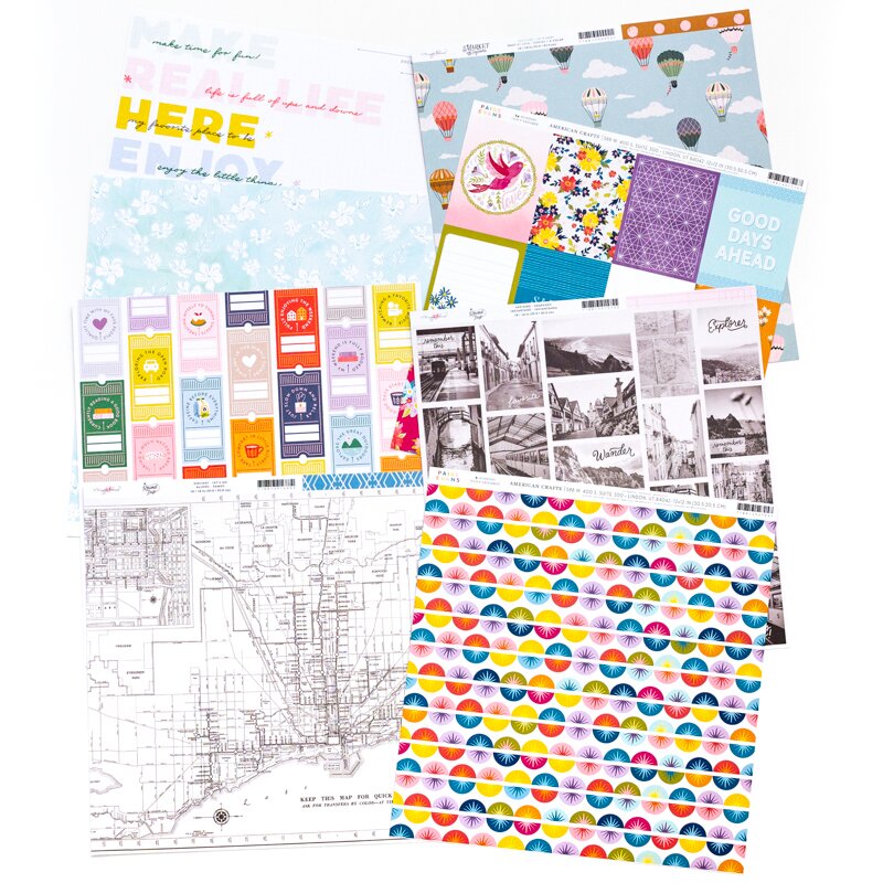 For my build I started with the same PinkFresh paper line and it turns out that I had a partial sheet of the ticket style print to tuck in my kit. I added in a map print based on the inspiration. Next came a jumbo text print from Shimelle to take the place of the word print from PinkFresh. Then a bunch of decisions had to be made to get to the final paper selection (see the video below for all the details!)