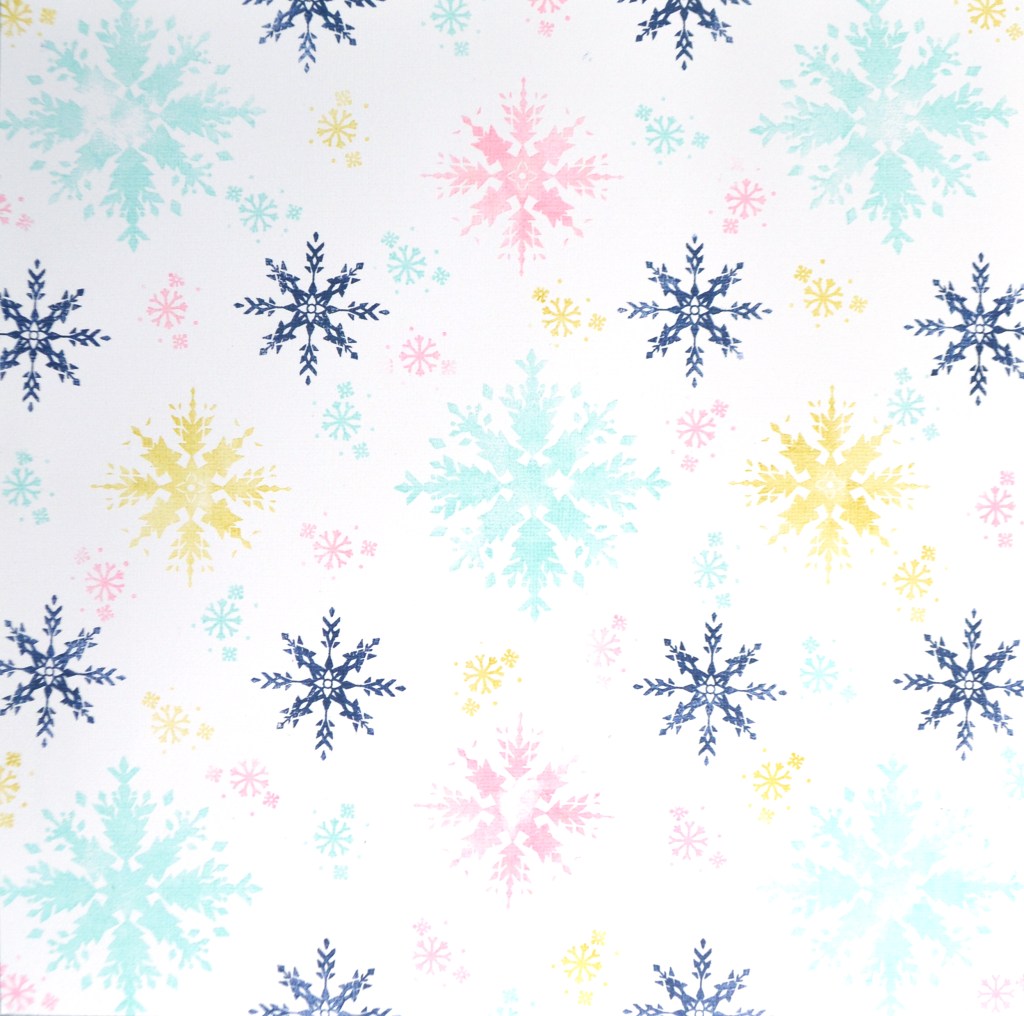 I pulled out a stamp set from Hero Arts called Color Layering Snowflake (just a quick tip: this set is currently on clearance sale over at Scrapbook.com for a great price!!^^ ) and my Concord & 9th inks and got to work. I added in some navy ink to match my kit a bit more and I ended up with a piece that I am very happy with.