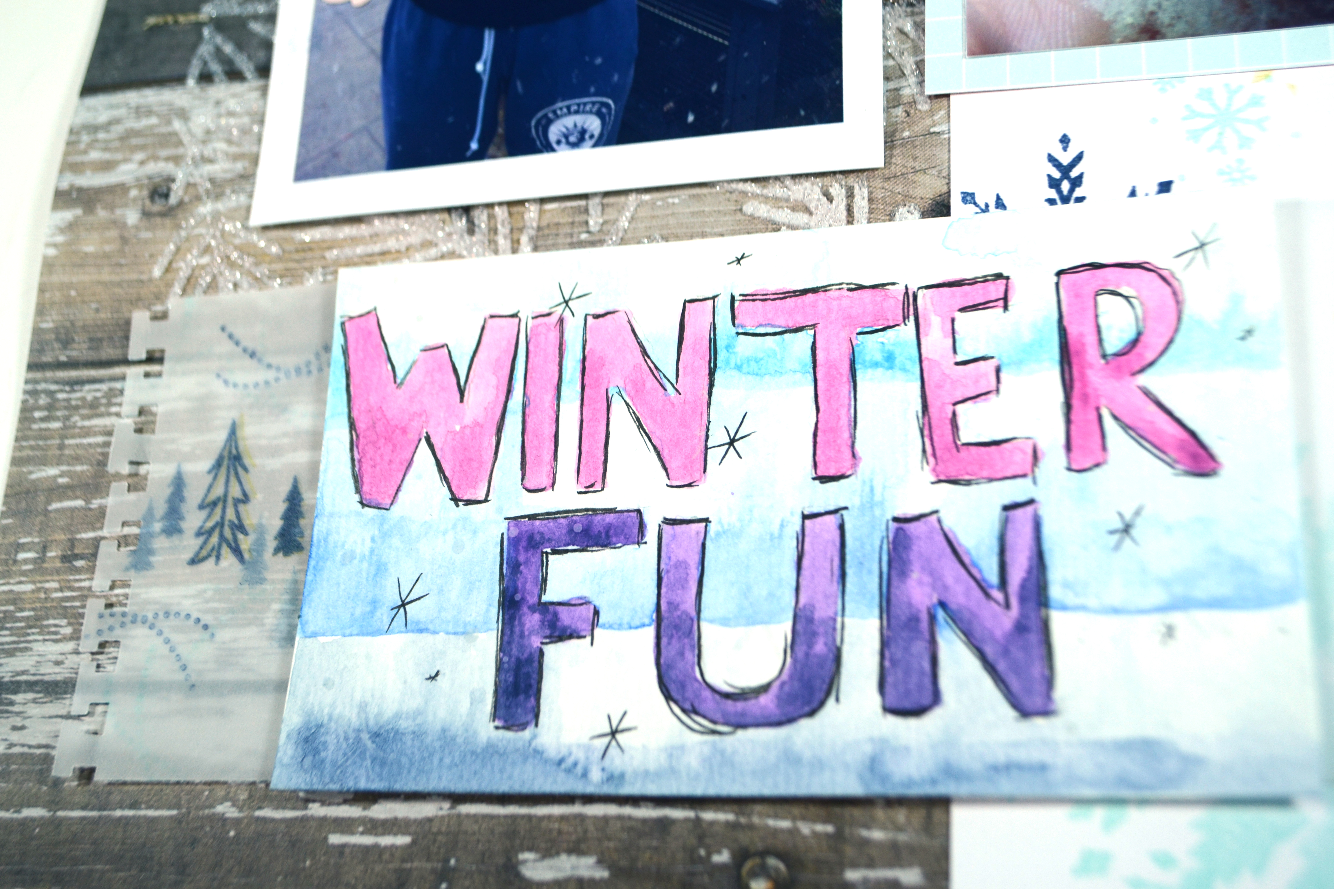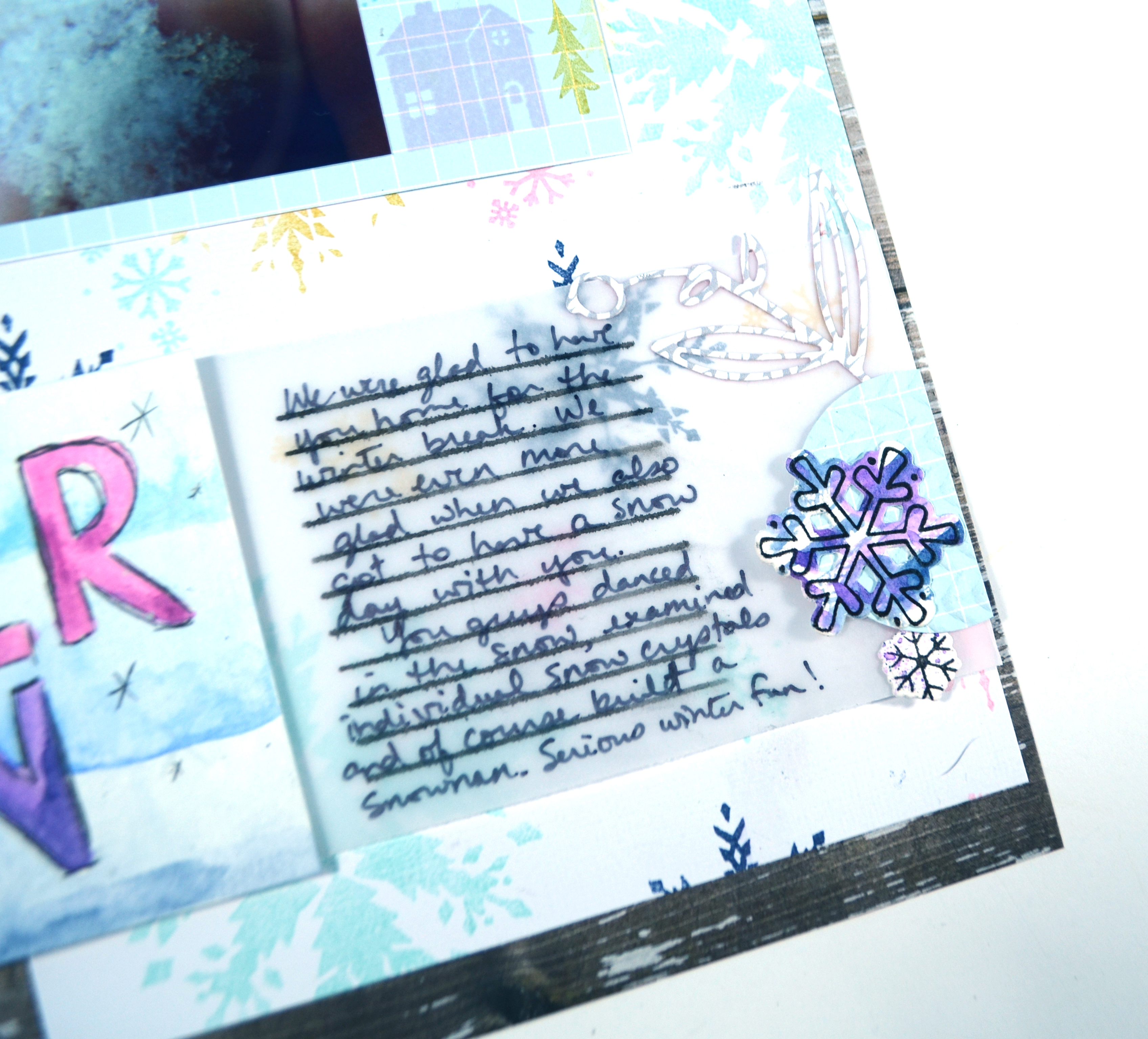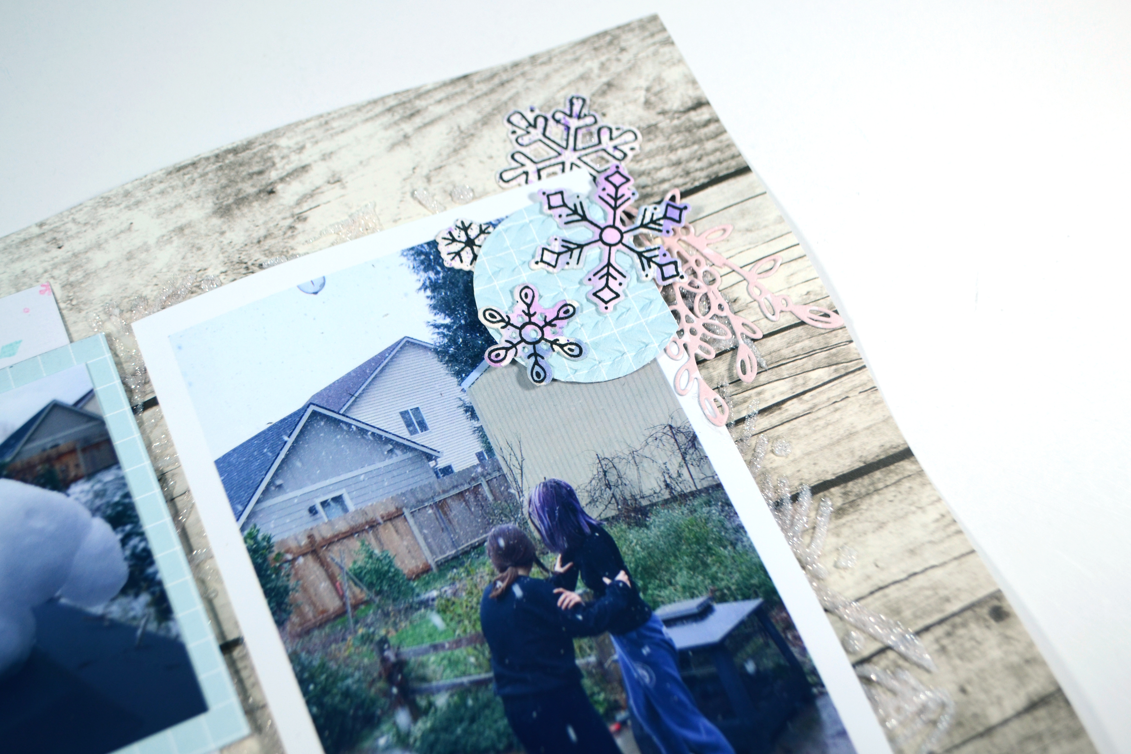 There was a lot of “making” on this layout. Not only did I use glitter paste mixed media to make a background, but I created all of the embellishments. Previously I made the snowflake paper and the title card. I die cut foliage, watercolored & stamped snowflakes, and added a bit more other stamping., If you want to see the whole process of pulling all these pieces together, I’ve got a video for you.