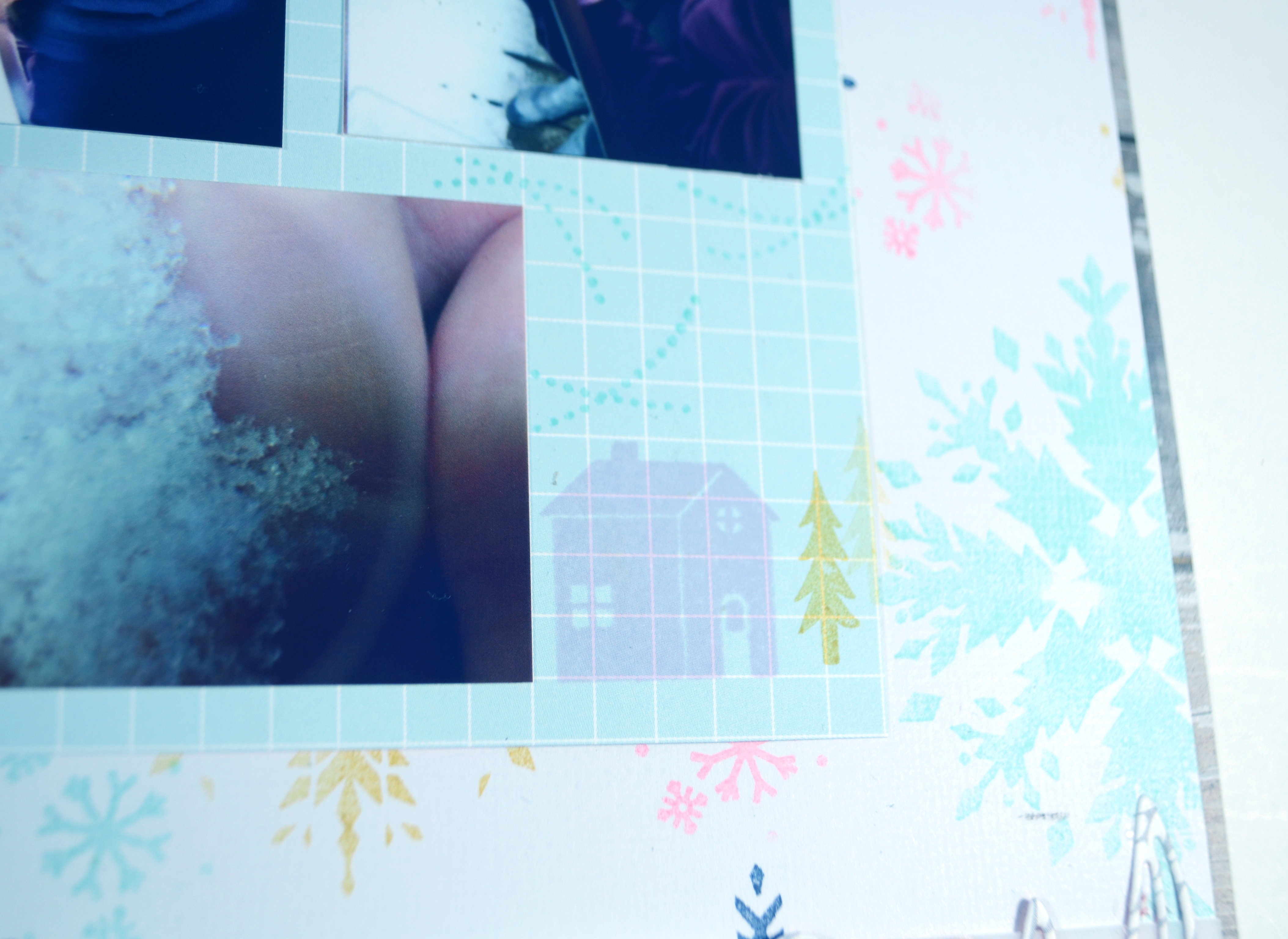 And here is my interpretation. I replaced some of the photos with clusters of photos. I adjusted some of the paper blocks with mixed media (details shots below). Finally, I turned my title and journaling block to be horizontal instead of vertical. Simple changes and I have a different layout.