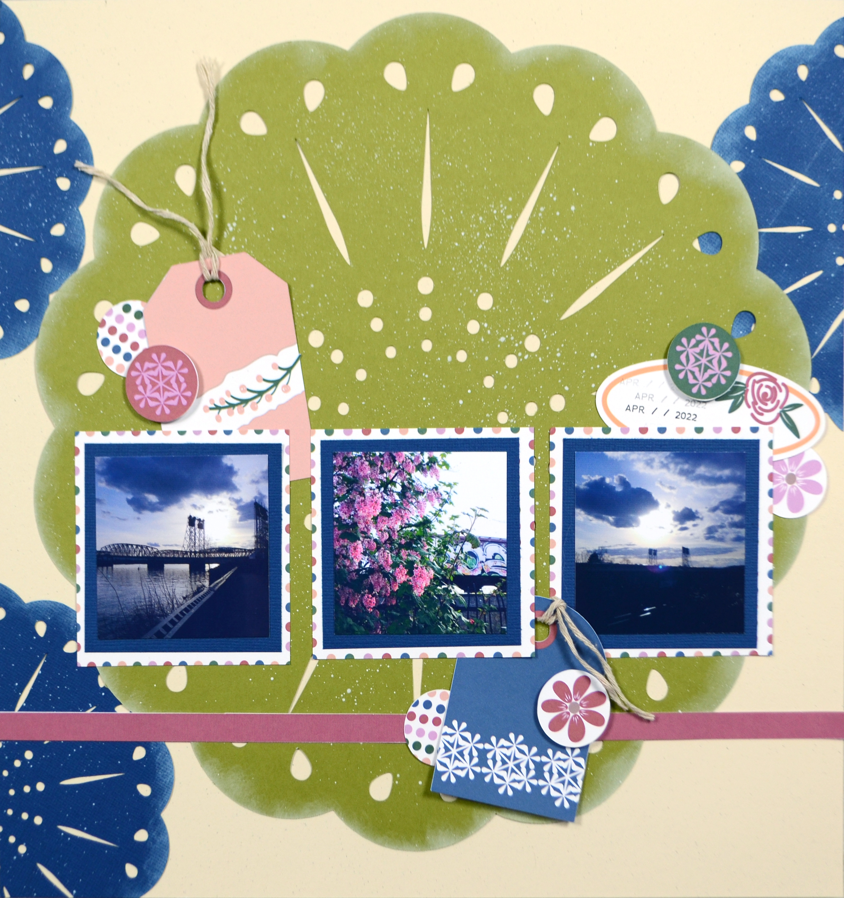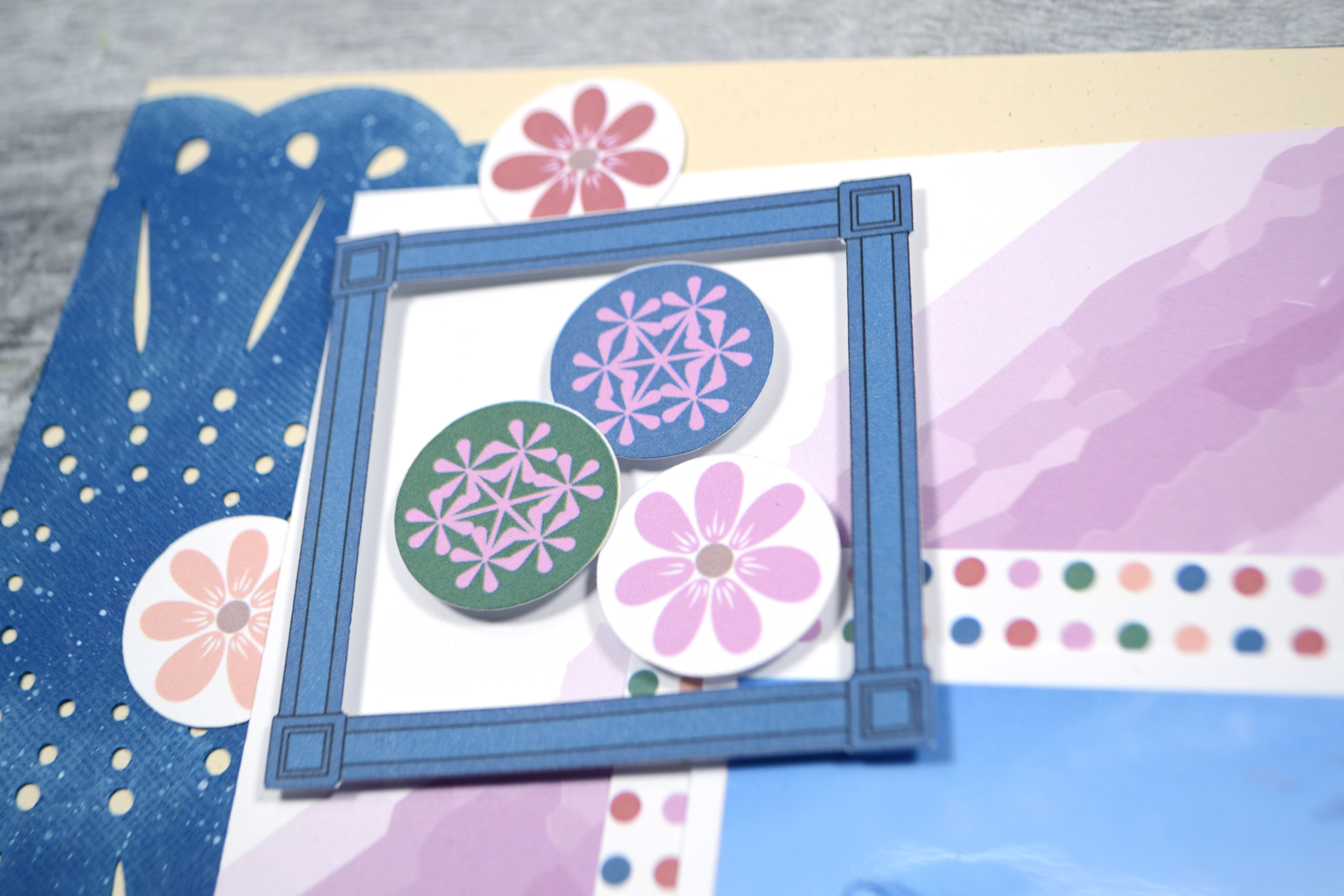 The pattern papers are ready to print and use. Embellishments will either need to be fussy cut, or use the print-then-cut version for your electronic die cut machine. I try to keep the fussy cutting to simple shapes and any circle elements can be punched out with a 1″ circle punch or die. Any cutting tips beyond these will be in the current video reveal!