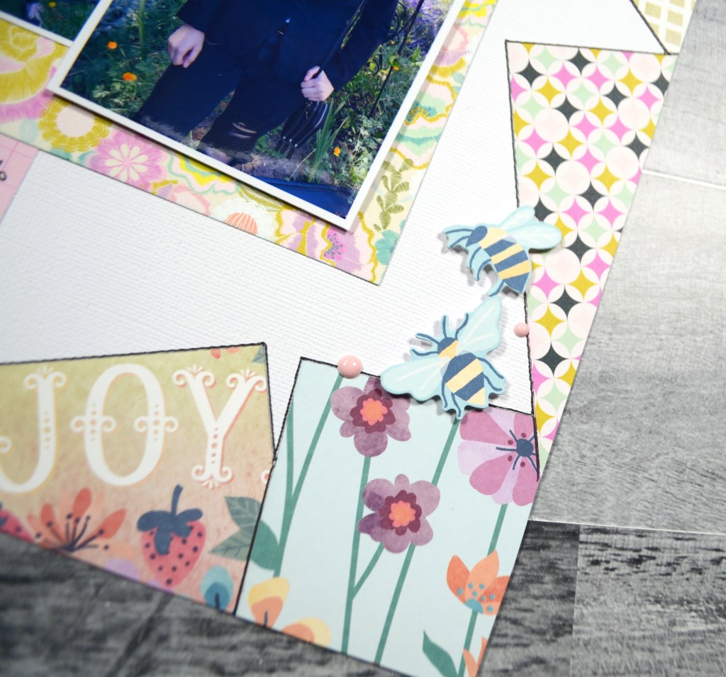 I wouldn’t want to leave you wondering just what to do with these supplies. So I almost always make a project as soon as my box arrives. That way I am sure to use it instead of just showing it off. This time around I again made a 12×12 layout. But I had an interesting idea on how to put that 6×6 pattern paper to use! Check it out.