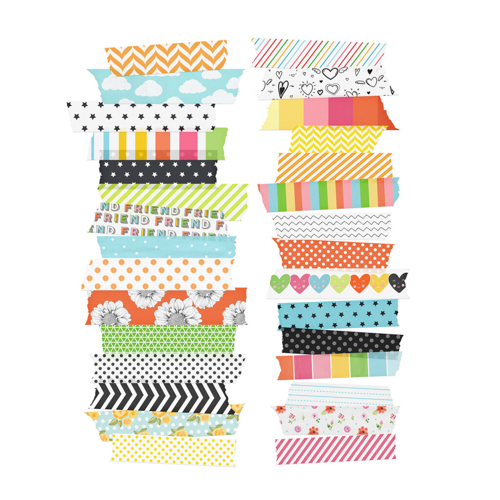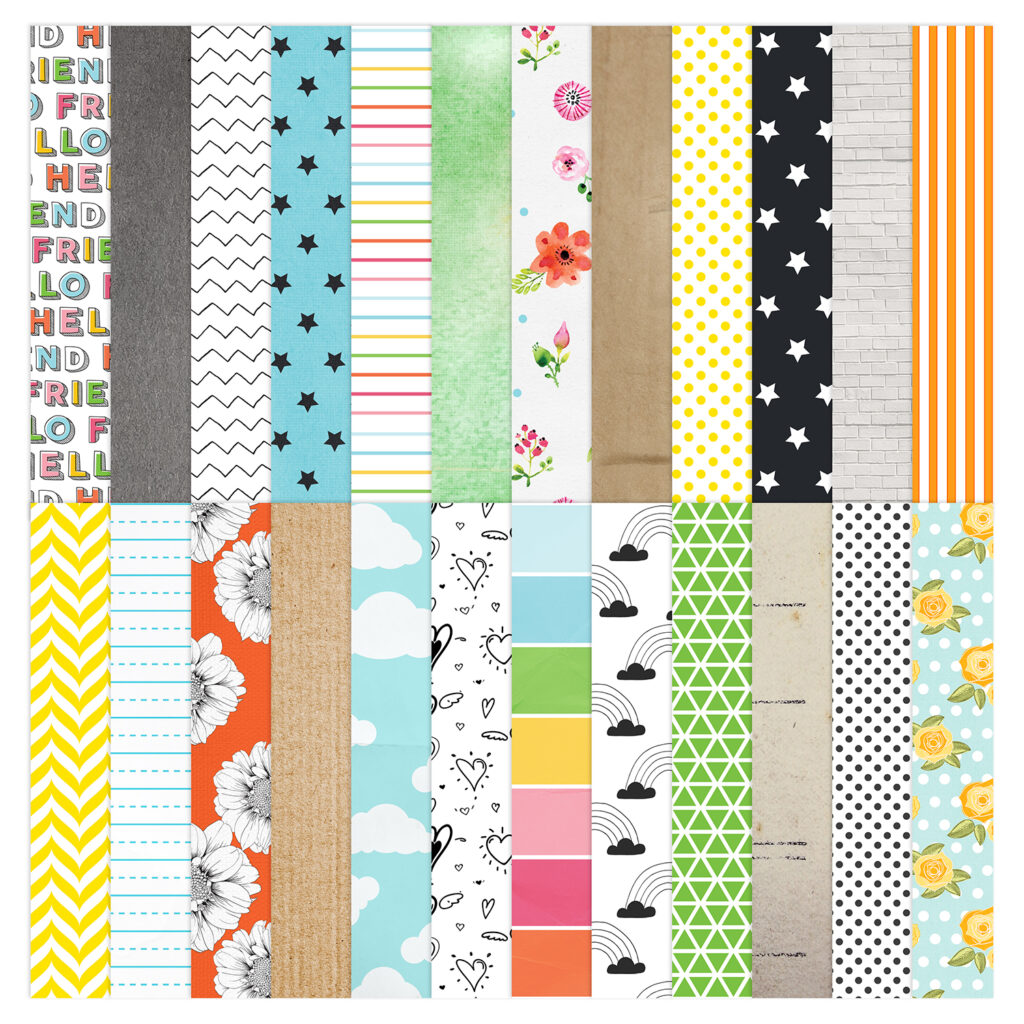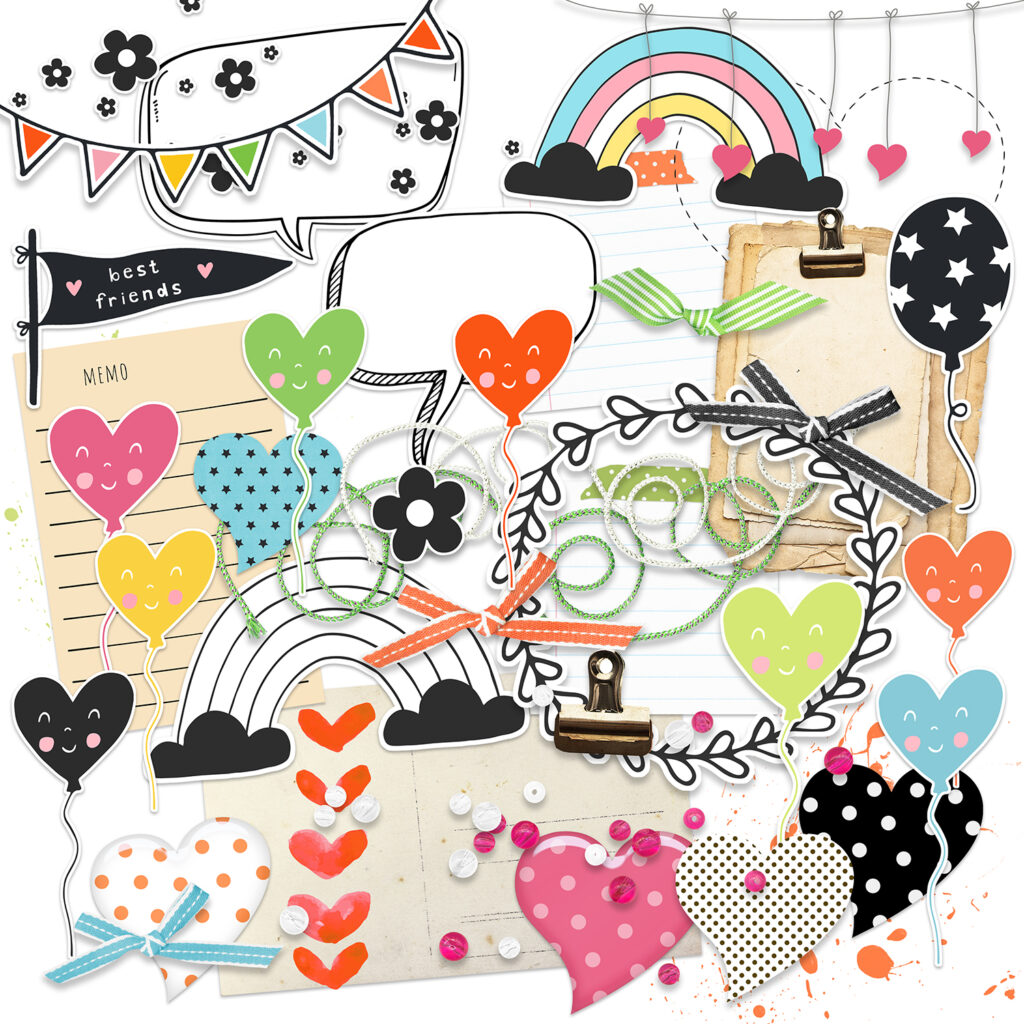 I was inspired by rainbows and clouds, pops of black and white, washi tape, flair buttons and a few other bits and pieces. The very first thing I wanted to pull was my own paper collection design since it had clouds and rainbows! (It is a free download and you can check it out if you want more information.)
