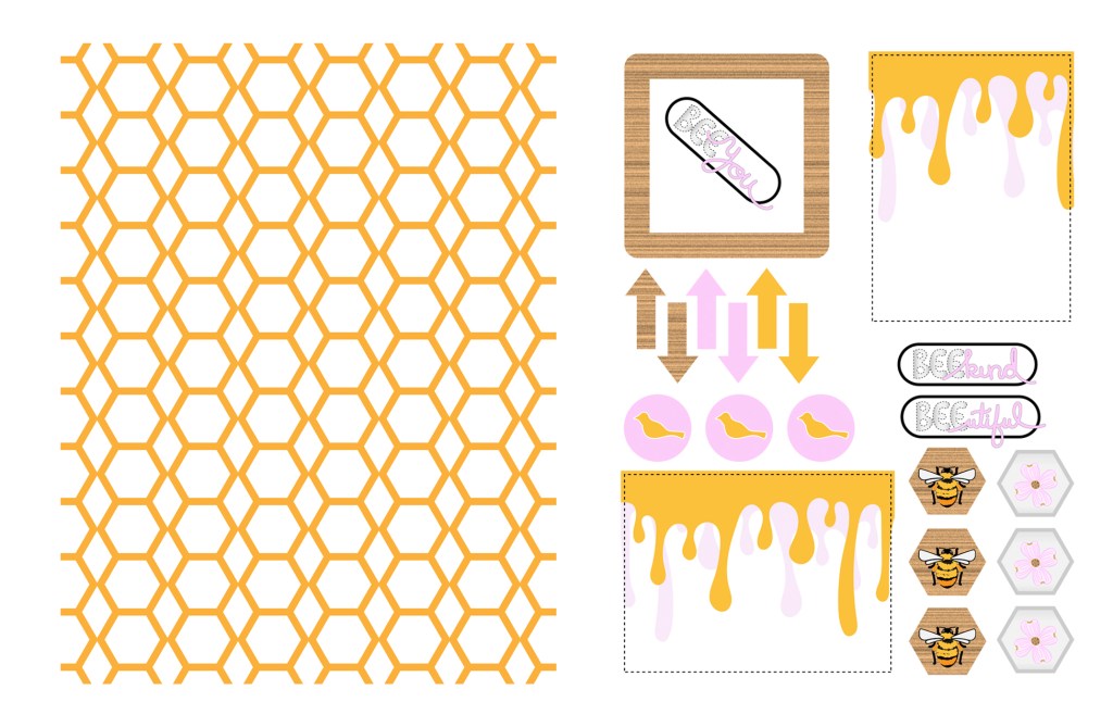Here is some further exciting news… new for 2023 are PRINTABLES.!! You can print them at home, cut apart the embellishments and use them to create your projects. This month I was inspired by the bees and hexagons which have been a part of my work lately! You can see all the details in my reveal video, or read on for the short version.