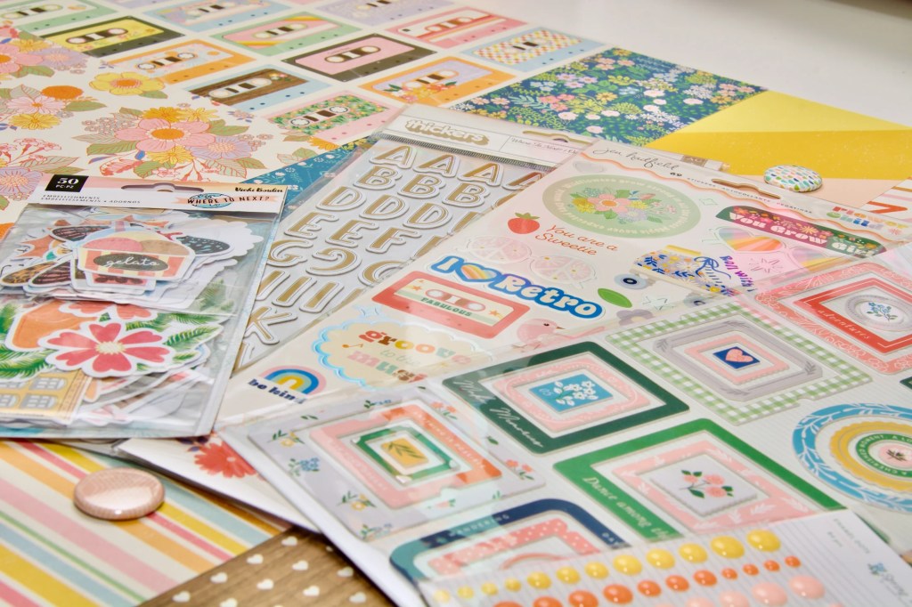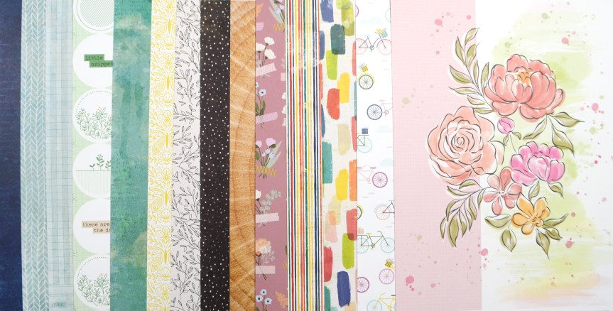 Here are the papers I came up with. I believe I only added in those three designers. I really loved that cassette tape paper from the inspiration and considered adding a Bella Blvd vinyl record paper, but the colors were wrong. Instead I used that bicycle paper from PinkFresh (see below) to replace that cassette tape. That along with the big floral are my focal papers for the kit. Not quite the same vibe as the original, but they have their own groove and lean to specific stories for me.