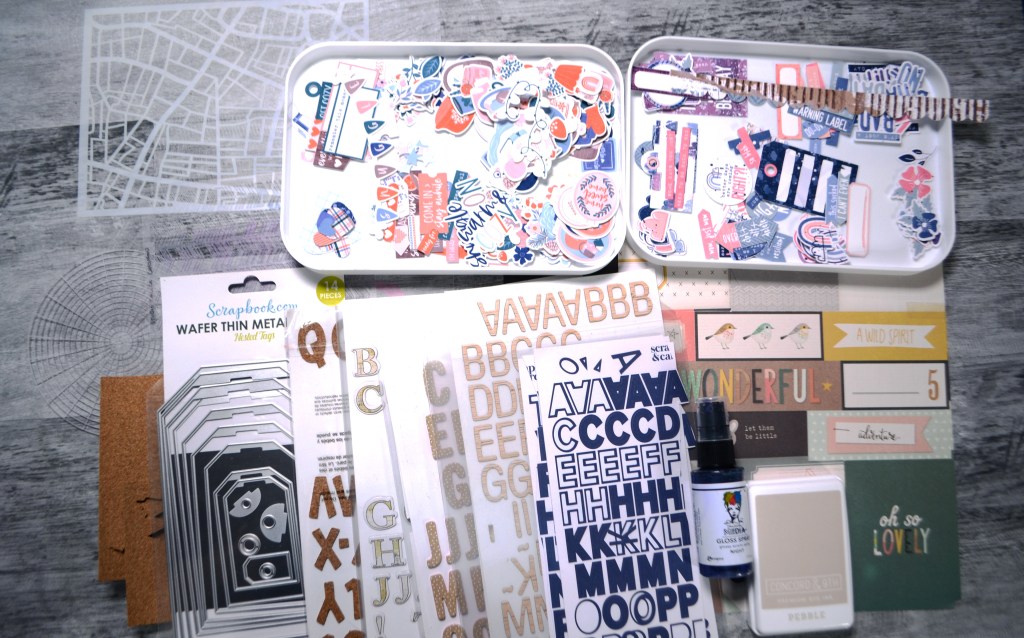 I have lots of die cuts (too many really to use in one month!), a bit of cork inspired by one of the brown kit papers, as well as stencils and navy spray in my embellishments. I pulled several alphas in browns and tans and one navy. They all have most of the vowels used up so hopefully I can get some titles out of these. That is why I pulled so many! Check it out.