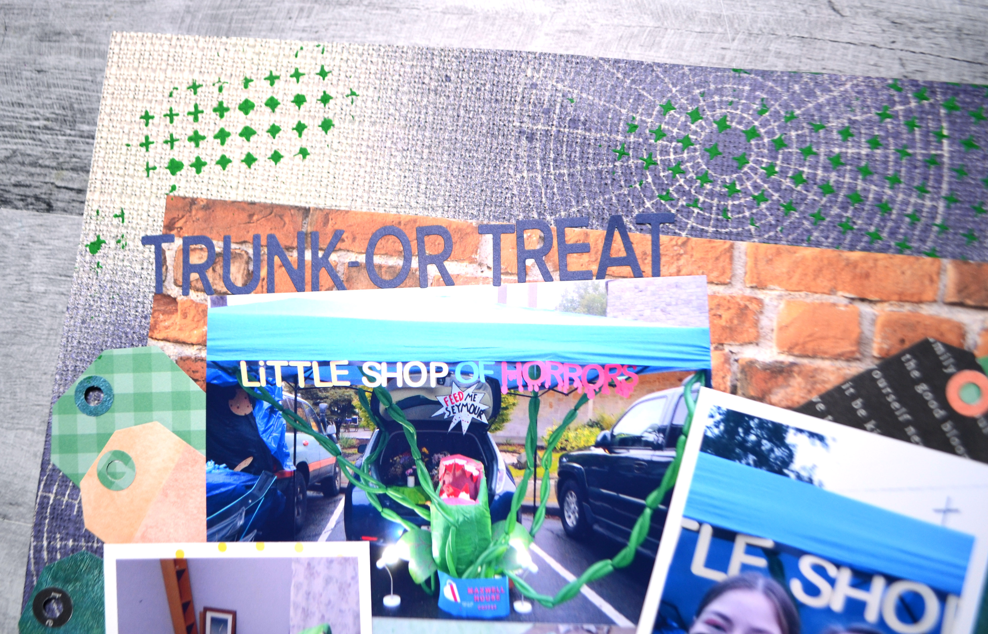 I told this story of creating decorations for a school trunk-or-treat even. My daughter and I designed our trunk based on the Little Shop of Horrors musical (specifically the movie from the 80’s as that is my era!). As the movie is set in the inner city the brick paper felt like a perfect base for the photos. I did change out the banners for tags. My mixed media was acrylic paint (green pluses) and spray mist. Both were chosen for their messy textural nods to all the materials that went into building our Audrey II monster.