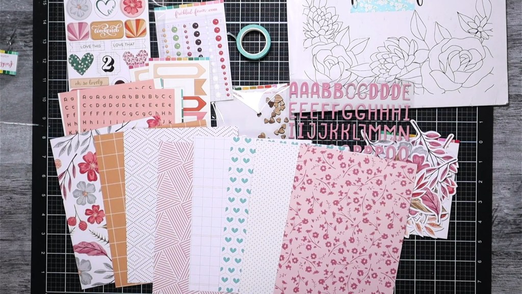 I am still struggling with some lighting issues in my space after one of my light fixtures went kaput. So this is not the most flattering photo, but you can still see all the pretty colors, textures and patterns included in the kit.