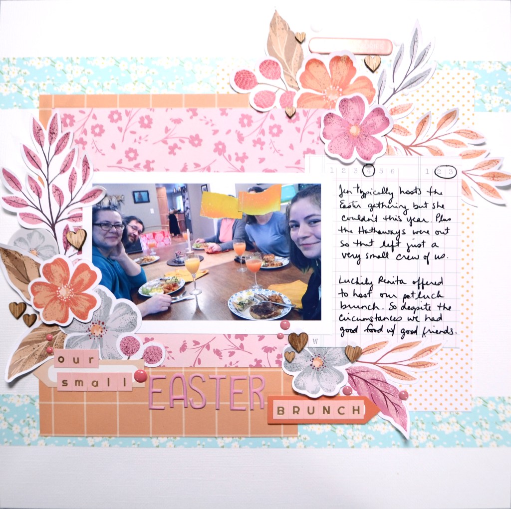 I wouldn’t want to leave you wondering just what to do with these supplies. So I almost always make a project as soon as my box arrives. That way I am sure to use it instead of just showing it off. This time around I made a 12×12 layout based on a sketch from a sketch class I am taking.