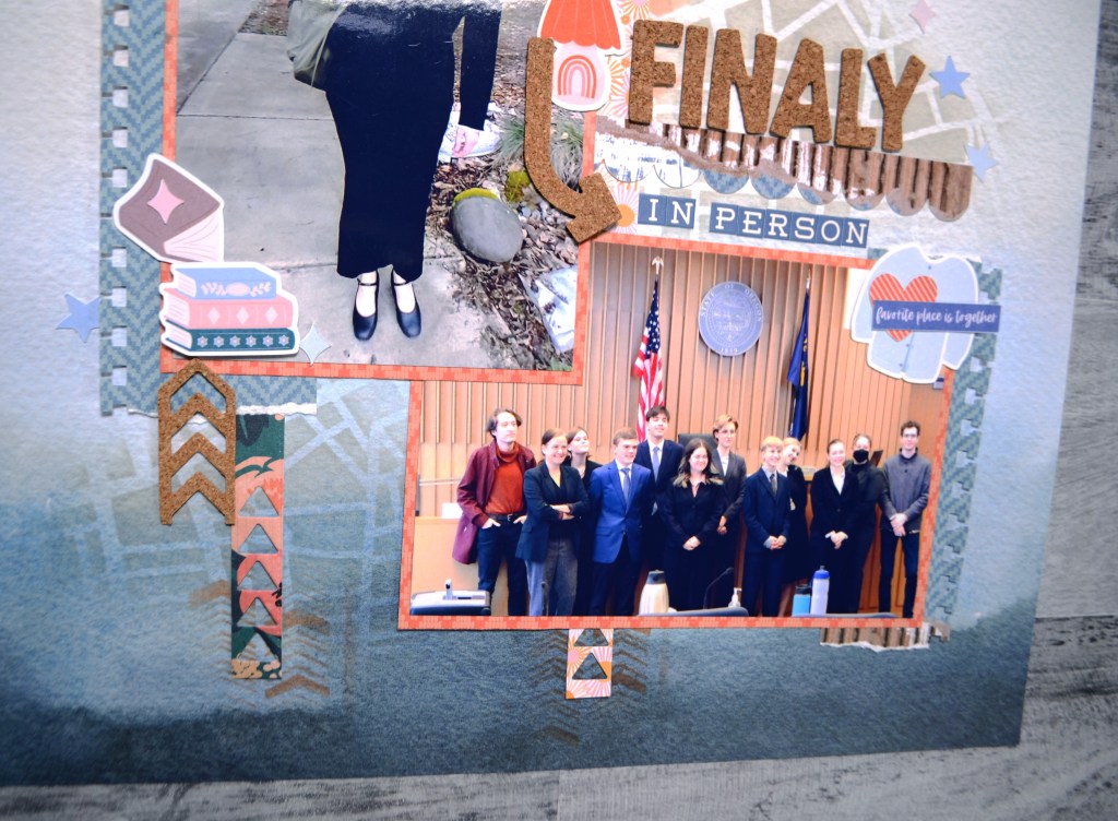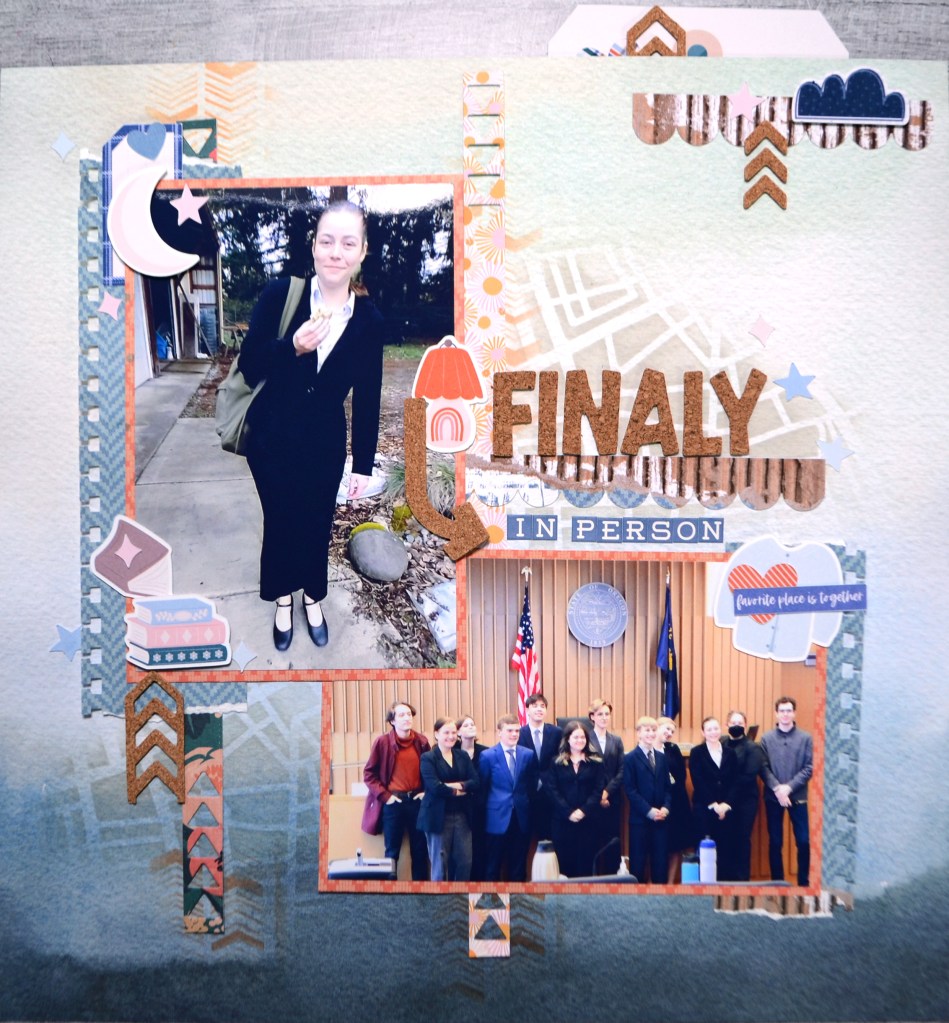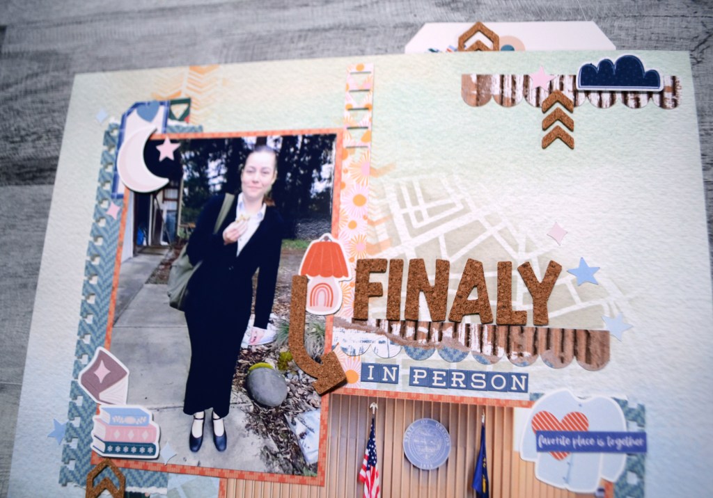 I liked the vertical lines, the bold title and offset photos. I decided to interpret the triangles using mixed media instead. I did lose a bit of that feeling when all was said and done. But… that is how sketches go sometimes!