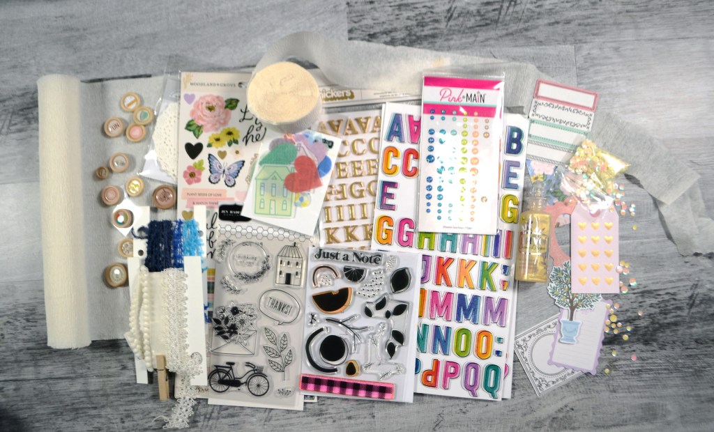 On to the embellishments. I jam packed my kit with just about everything found in the inspo: die cuts, wood buttons, fibers, enamels, sequins and on and on. I even have some beautiful forgeries for you this month. But you’ll have to come back on the 4th for that project.