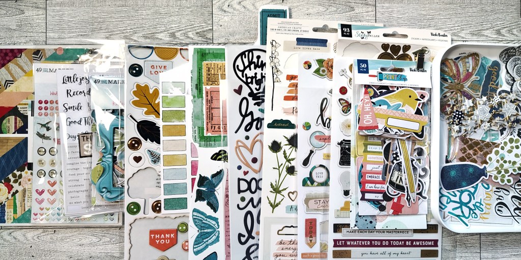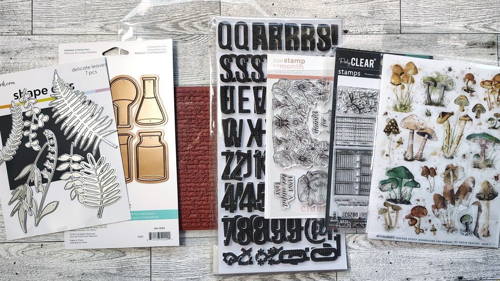 Can’t forget elements for mixing the media. So I have stamps and dies as well. My alpha and rubons ended up here since I forgot it in the above photo!