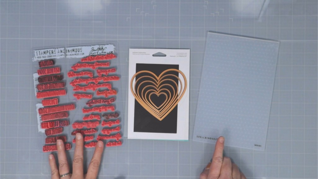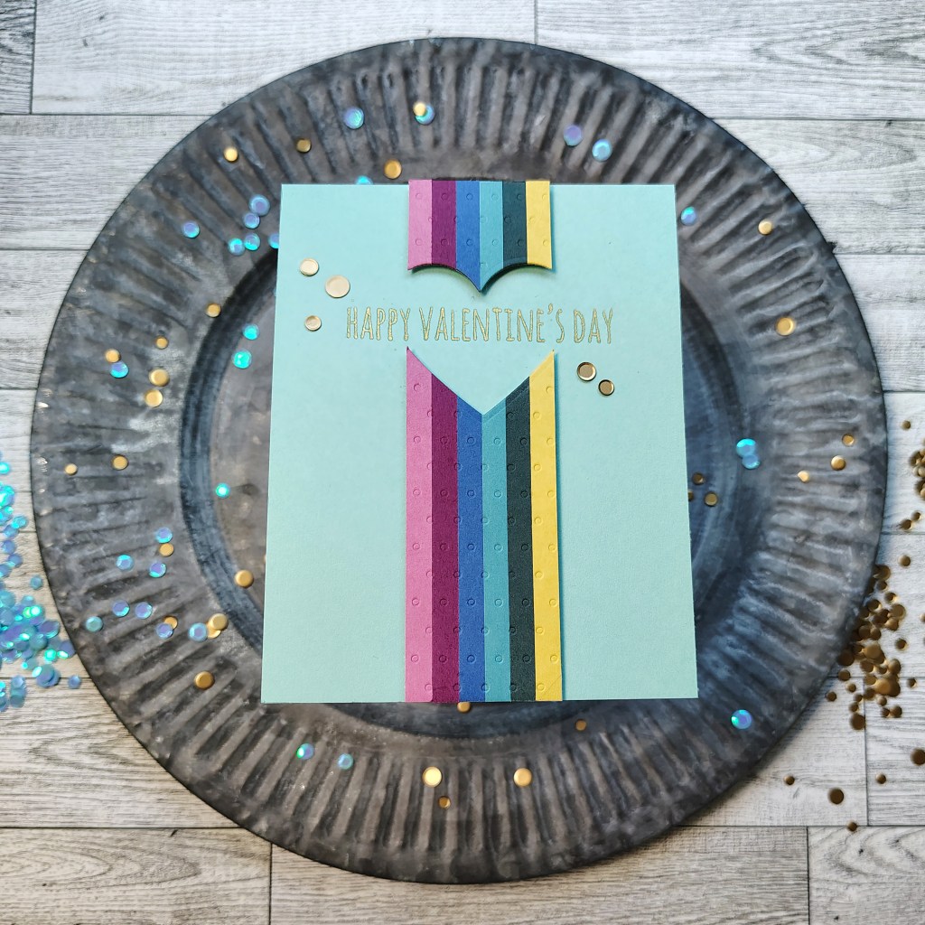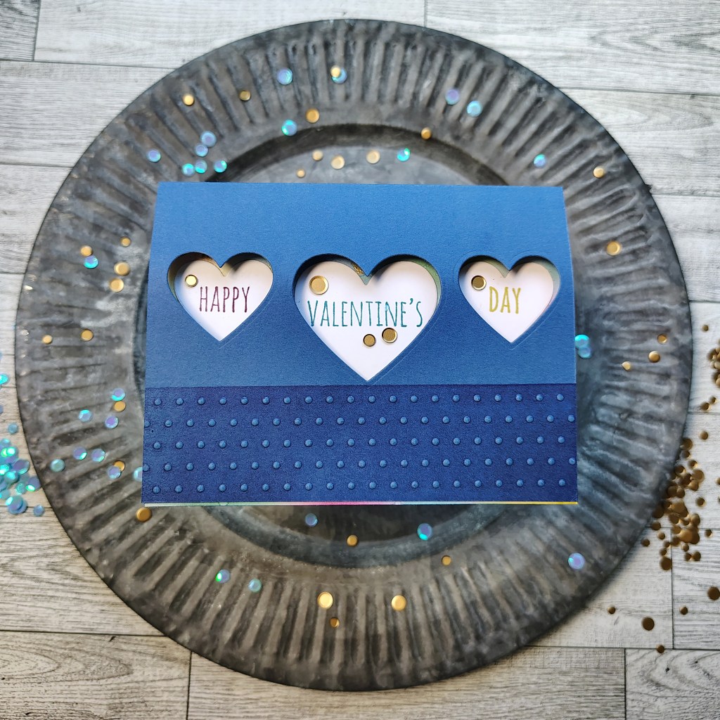 I started with a sentiment stamp set that can be created for a Gal-entine’s sentiment or for more typical Valentine’s. I have a nested set of heart dies. Having different sizes allows for more design options. Finally a simple geometric 2D embossing, in this case polka dots, will add some texture to the designs.