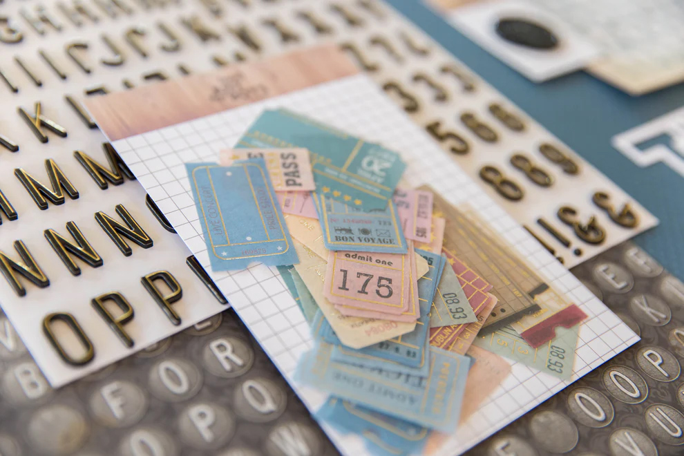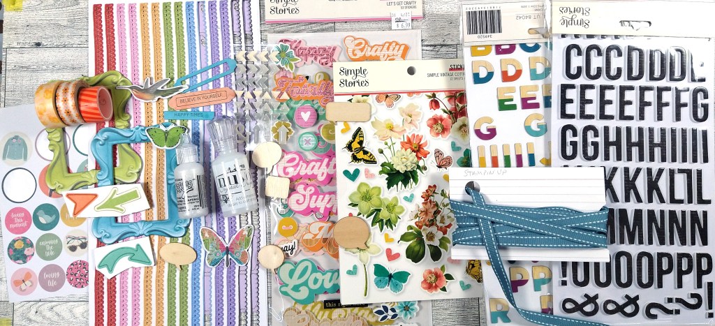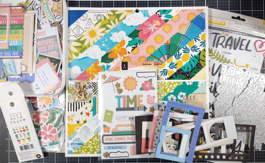 I had some good options to go with many of the inspo papers. I did swap in a more colorful stripe in place of a plaid paper. Then I just added one more bold color stripe from Vicki Boutin. Using those two items, I brought in more yellow, blues and green in cardstock. This will help me feel flexible in my story options.