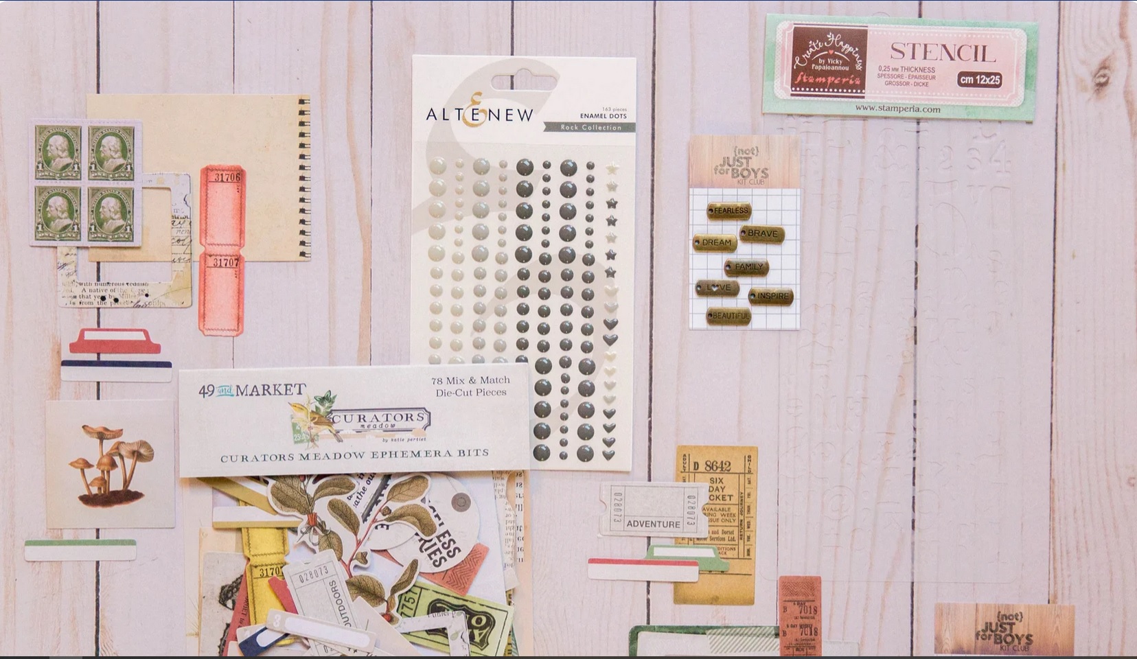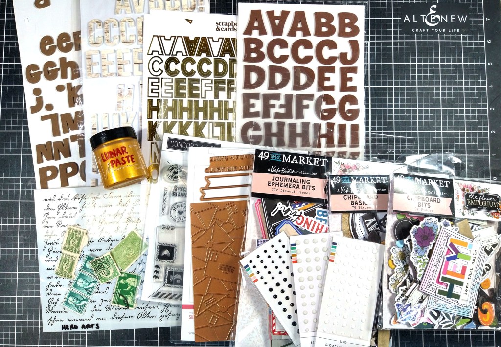 Moving on to embellishments… I found some great items that worked with the kit. I do have a bit more color with my chipboard, cutaparts and enamel dots. I also tucked in many stamps that I will put to use when I make my own supplies for this kit. Over at CKC we call that our Forgeries on the Fourth. For me I call it my Monthly Makes. I hope you’ll come back on the fourth to see what I do with those stamps. I have been wanting to do this for a while now! Plus I have more ideas to play with!