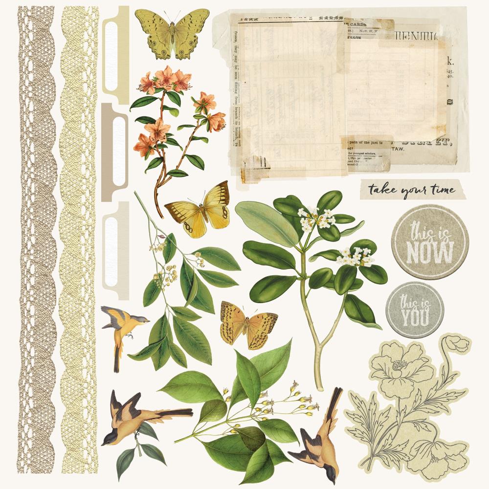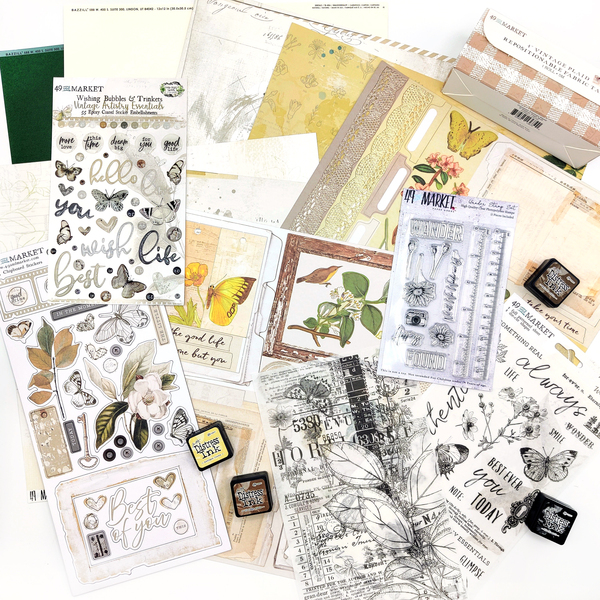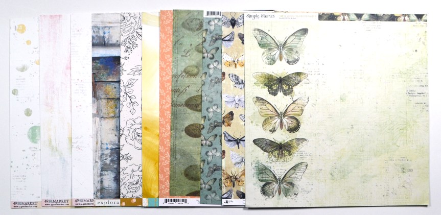 For my build I started with my own 49th and Market stash, which definitely has more color to it. But I picked out the papers with the most neutral overall look. I then added in papers from Simple Stories and others that had more color but kept a bit of a vintage vibe. And butterflies. There were lots and lots of butterflies.