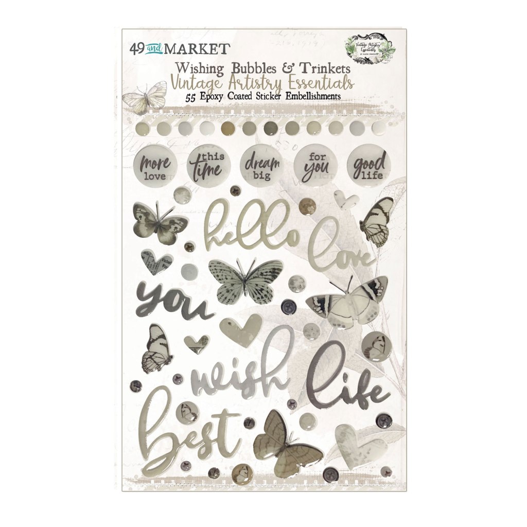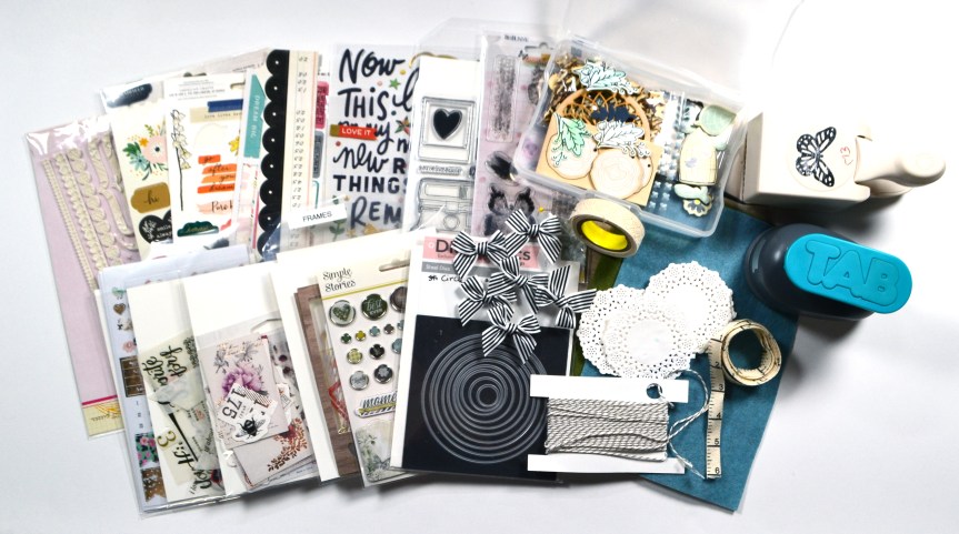 Embellishments were up next. This month I went a bit over the top! Just remember anything you don’t end up using can always be put away again for another day. I was just so inspired by these products that I wanted to up the ante. I pulled in journaling card stamps & die sets, mixed media supplies in stencils and sprays, twines, enamels, sequins, and the pre-printed “stickers”โI use them as die cuts reallyโdirectly from Traci Reed.