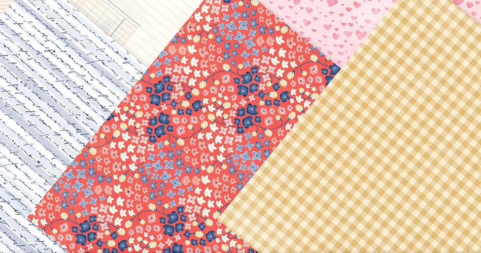 If we take a closer look at the embellishment cluster in the photo and these sheets of pattern paper, we can start to see something besides pink in this kit. We’ve got a coral red, a powder blue and a golden yellow.