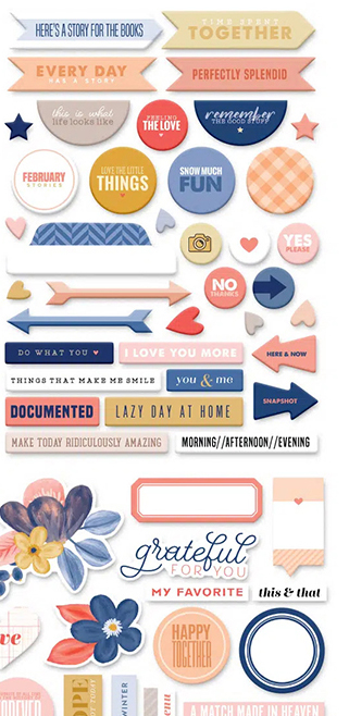 While I have a wide assortment of embellishments from Elle’s Studio (hearts), Concord & 9th (enamels), puffy & faux leather stickers (Citrus Twist), cut aprts (Scrapbook & Cards Expo, The Stamp Market, others) and more, most of my embellishments are again pieces from the Traci Reed collection. Since she offers “sticker sheets” that are super easy to print at home and then use a machine (Cricut, Silhouette etc) to cut for you, this makes embellies so much more affordable.