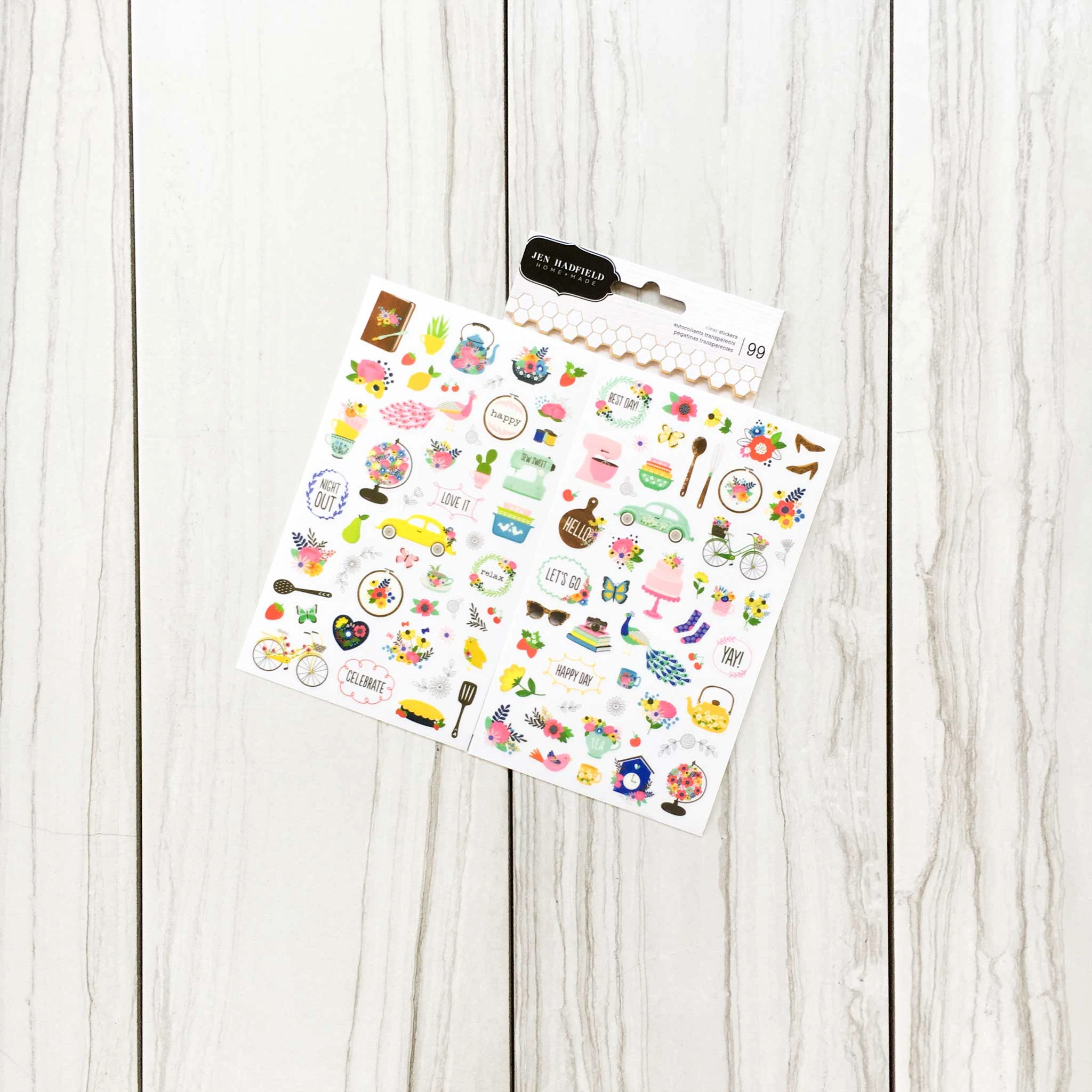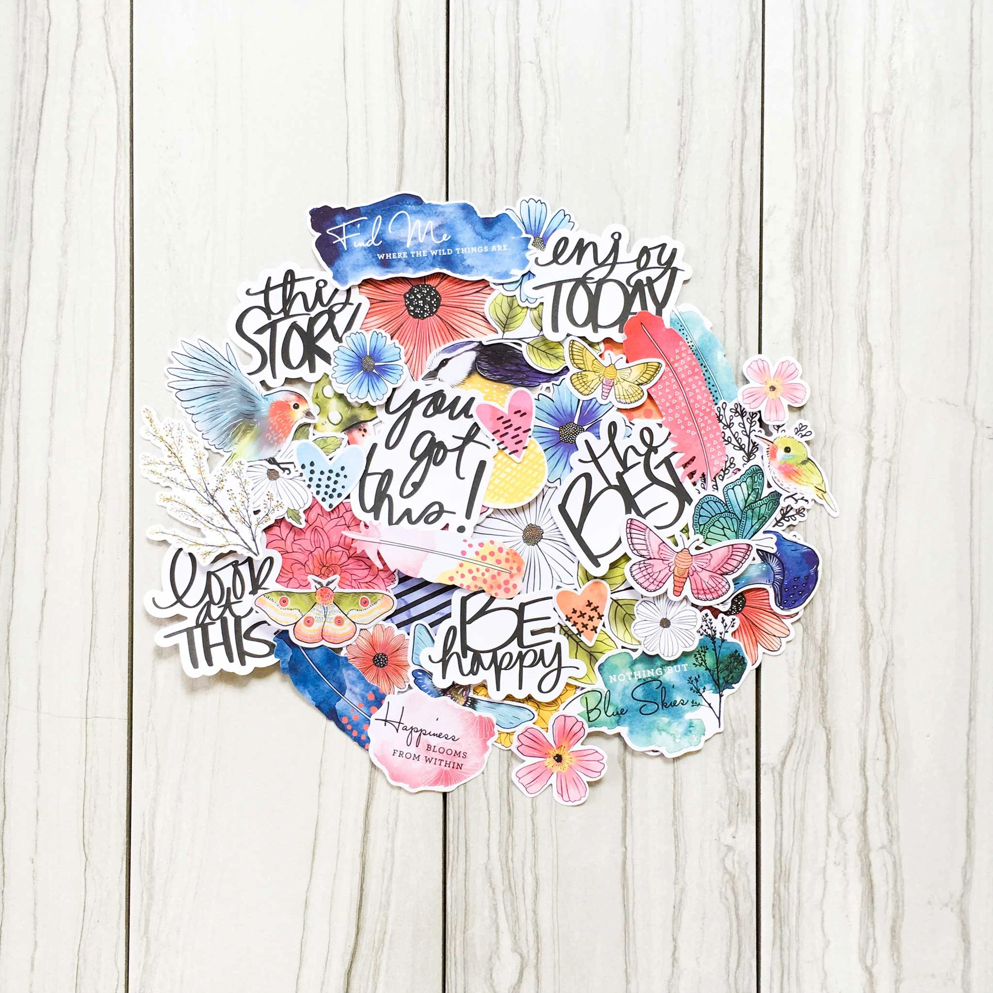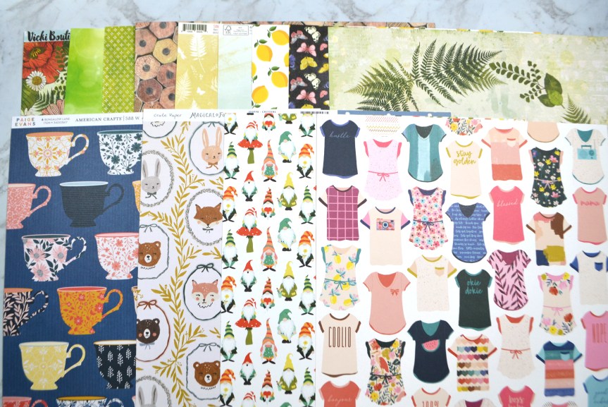 The top row of papers come directly from the kit inspiration. The lemon paper replaced the bird paper, but if you look at the Jen Hadfield sticker sheet, there are lemons in there! The second row of paper are extras that I was inspired to add. The cups are a nod to the food theme in the Jen Hadfield stickers. The critters are in line with some Easter thinking. The gnomes go along with an icon on the Vicki Boutin ephemera that I added. And the shirts are there for the home theme that emerged from the Jen Hadfield supplies.